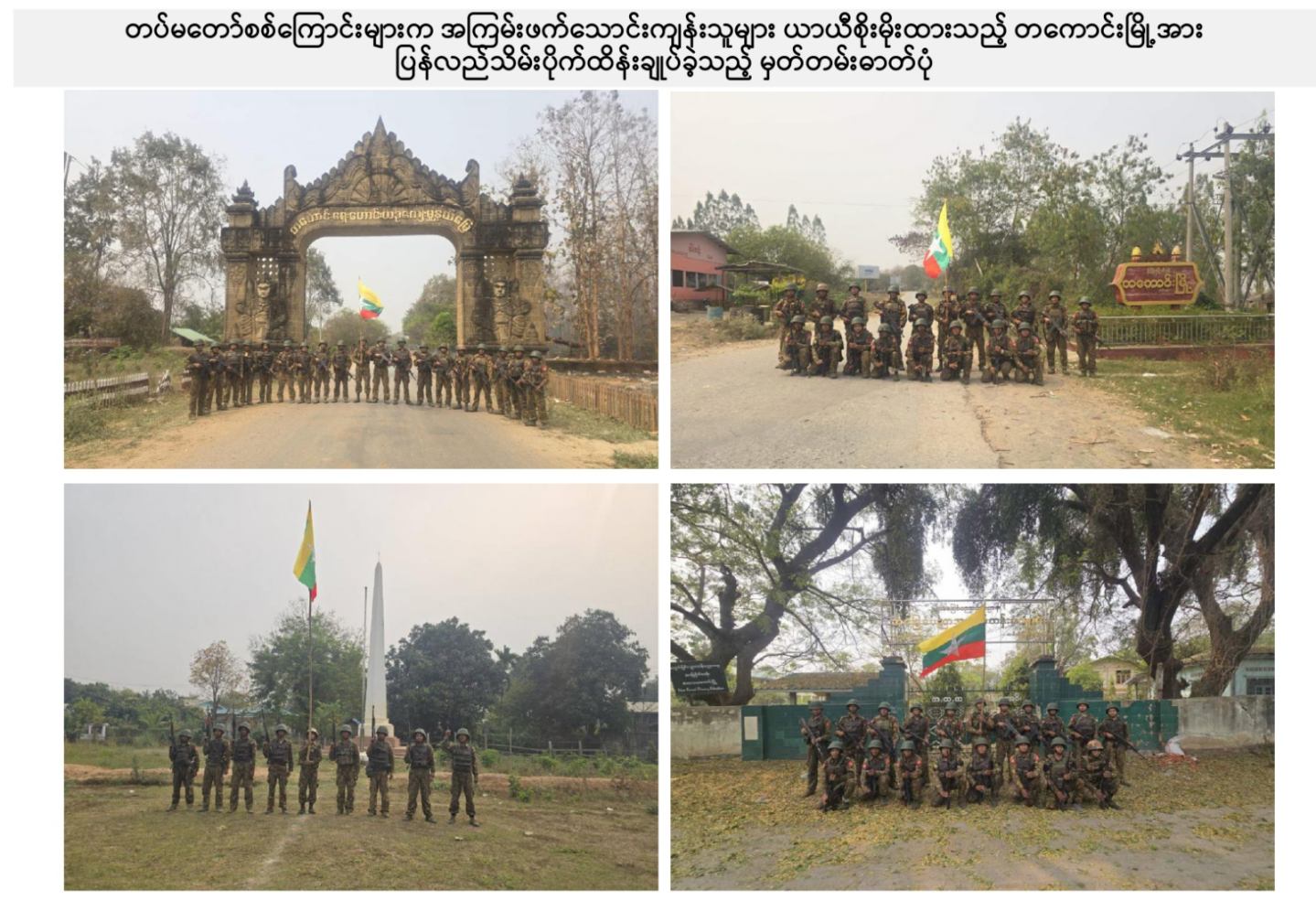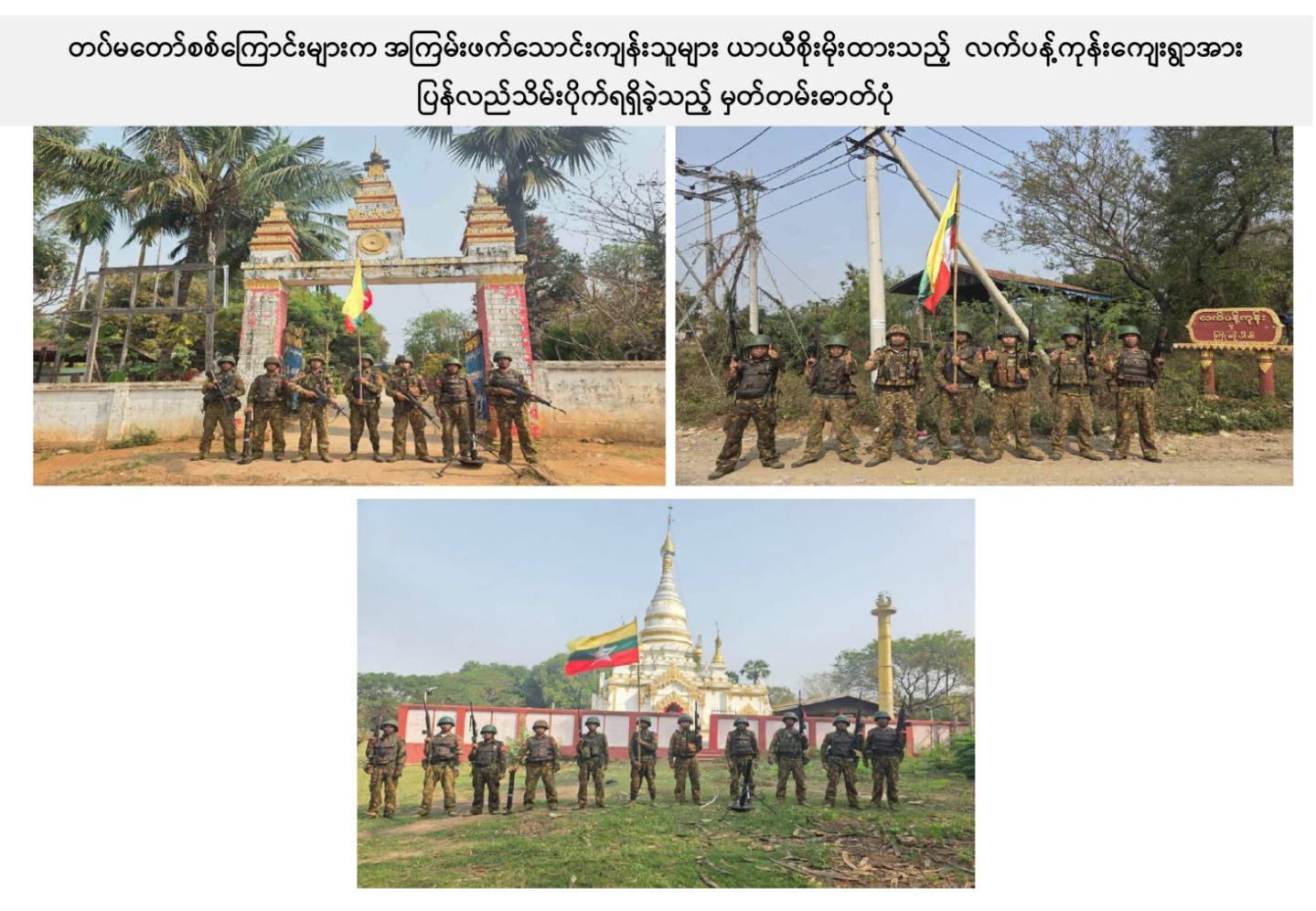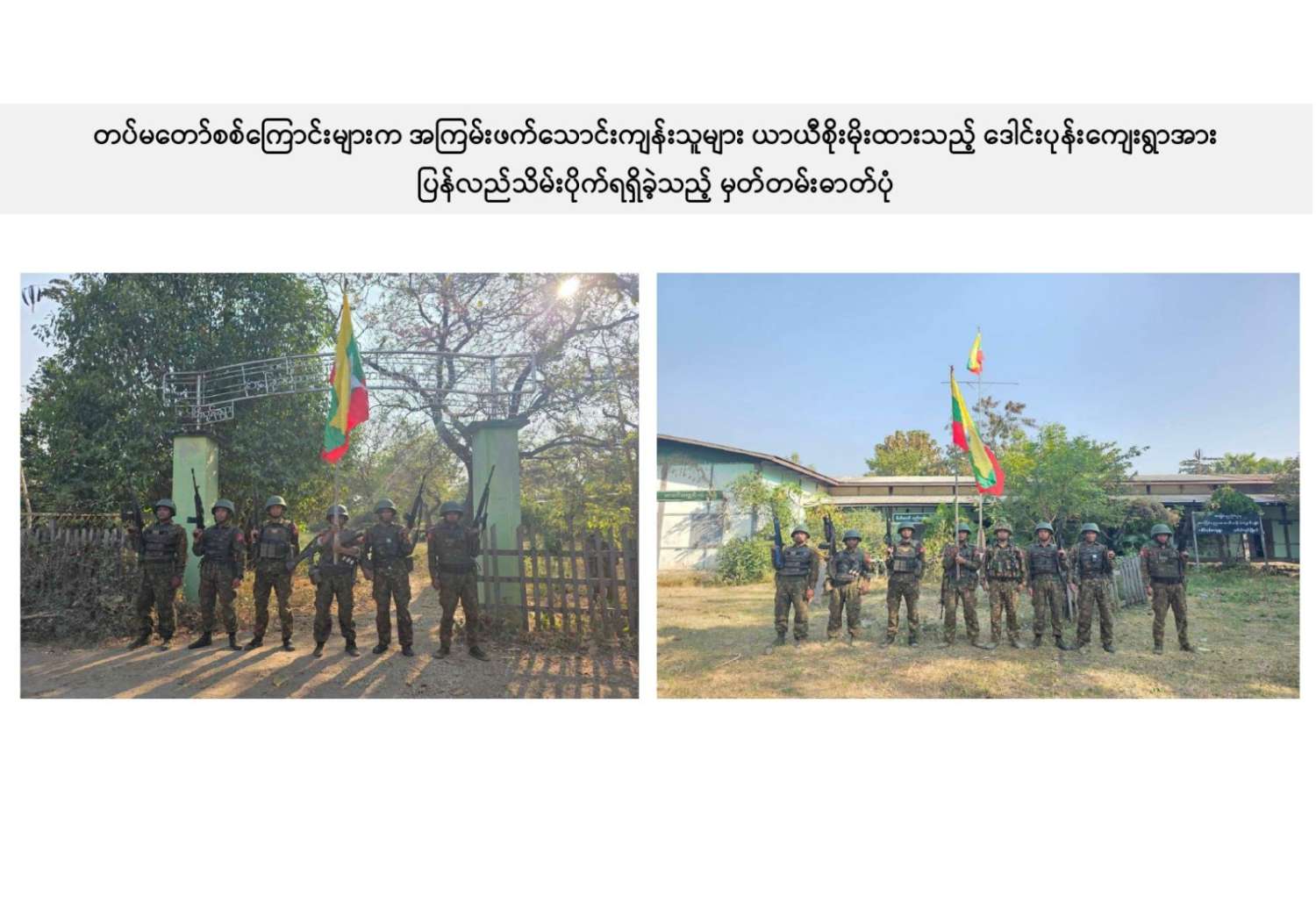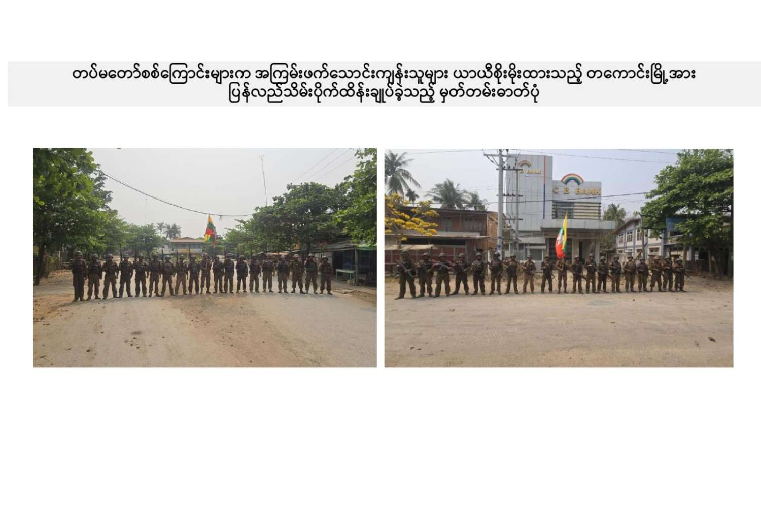 ယခုကဲ့သို့ တကောင်းမြို့နှင့် အဆိုပါပတ်ဝန်းကျင်ဒေသ၏ လုံခြုံရေး၊ ဒေသခံပြည်သူလူထု လိုလားတောင့်တလျက်ရှိသည့် ပြည်သူလူထု၏ လူမှုစီးပွားဘဝလုံခြုံခိုင်မာစေရေးအတွက် ရွပ်ရွပ်ချွံချွံ ဆောင်ရွက်ပေးနိုင်ခဲ့သည့် ရှေ့တန်းရောက် တိုက်ပွဲဝင်တပ်မတော်သား အရာရှိ၊ အရာခံ၊ အကြပ်၊ စစ်သည်များ၊ အလားတူ ရှေ့တန်းစစ်ဆင်ရေးတာဝန်များ ထမ်းဆောင်လျက်ရှိသော တိုက်ပွဲဝင် တပ်မတော်သားအတွက် အောင်နိုင်စိတ်၊ တိုက်ပွဲဝင်လိုစိတ်စသည့် စိတ်ဓာတ်ခွန်အားအပါအဝင် လိုအပ်သည့် ကူညီထောက်ပံ့မှုများကို မဆုတ်မနစ်သော ယုံကြည်ချက်ဖြင့် ဖြည့်ဆည်းပေးလျက်ရှိသော တပ်မတော်သား မိသားစုဝင် ပါရမီဖြည့်ဖက်များနှင့် တပ်မတော်ကို အားပေးထောက်ခံခဲ့ကြသူအားလုံးကို လေးစားစွာ အသိအမှတ်ပြု ကျေးဇူးတင်ရှိပါကြောင်းနှင့် တကောင်းမြို့နှင့် ၎င်းဒေသတစ်ဝိုက်အား တပ်မတော်က ပြန်လည်သိမ်းပိုက်နိုင်ခဲ့သည့်သတင်းအား ပြည်သူ့ဆက်ဆံရေးနှင့် စိတ်ဓာတ်စစ်ဆင်ရေး ညွှန်ကြားရေးမှူးရုံး ကွပ်ကဲမှုအောက် မြဝတီရုပ်မြင်သံကြားအဖွဲ့သားများက ဂုဏ်ယူစွာဖြင့် သတင်းထုတ်ပြန်အပ်ပါသည်။