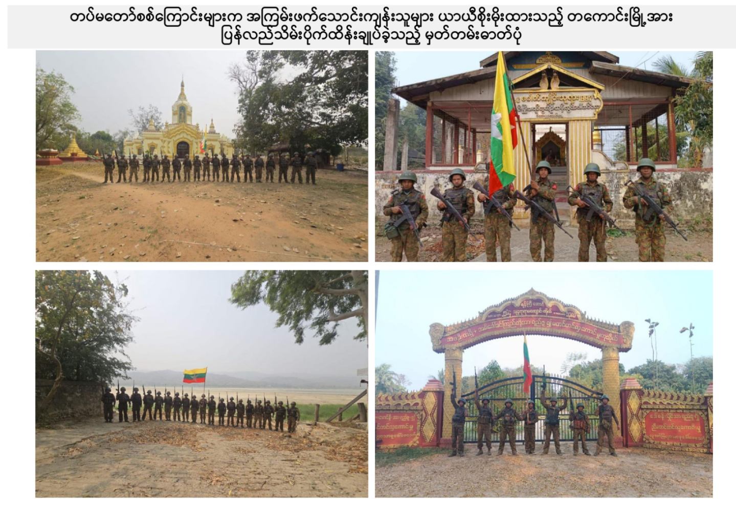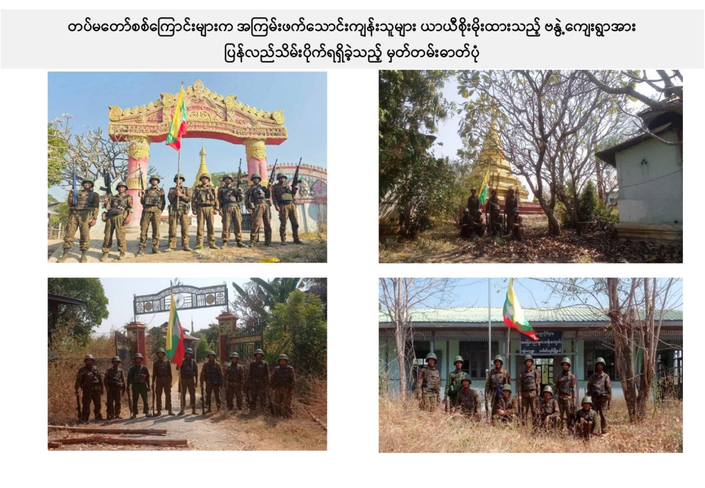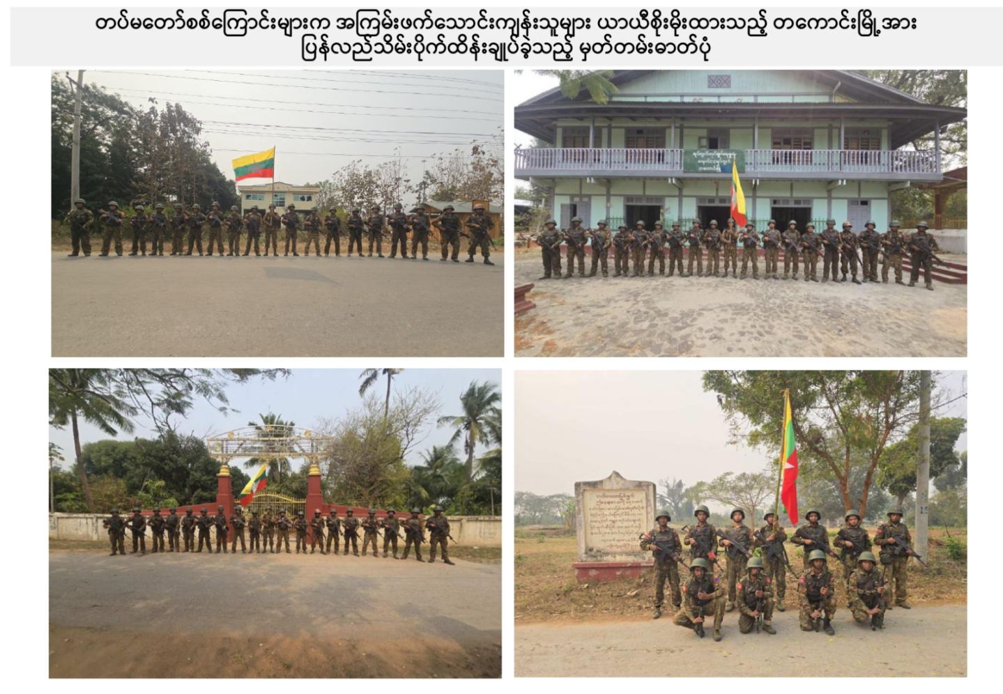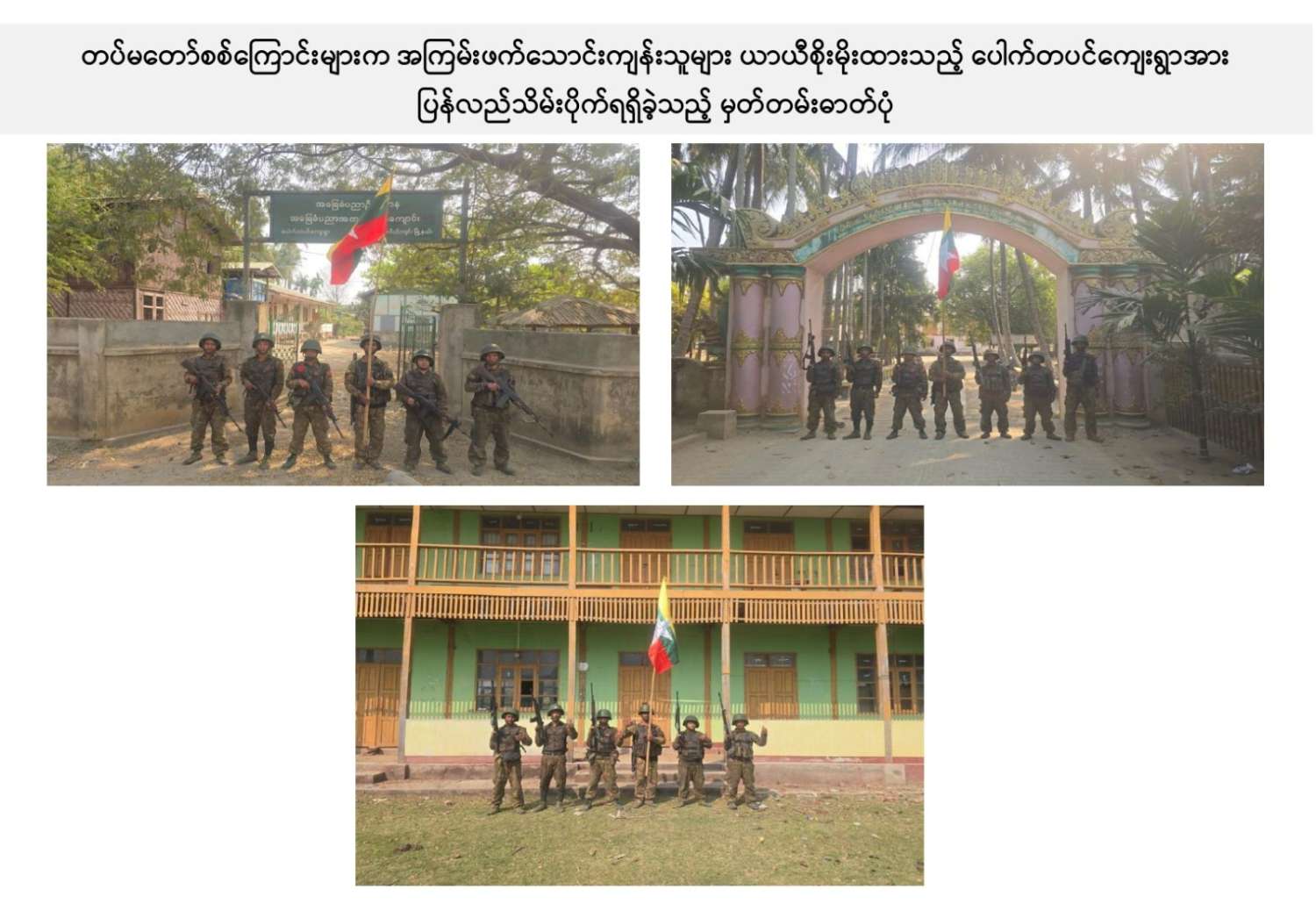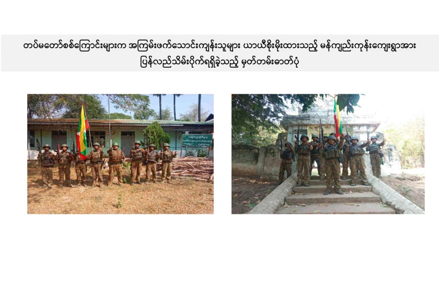 ယခုကဲ့သို့ တကောင်းမြို့နှင့် အဆိုပါပတ်ဝန်းကျင်ဒေသ၏ လုံခြုံရေး၊ ဒေသခံပြည်သူလူထု လိုလားတောင့်တလျက်ရှိသည့် ပြည်သူလူထု၏ လူမှုစီးပွားဘဝလုံခြုံခိုင်မာစေရေးအတွက် ရွပ်ရွပ်ချွံချွံ ဆောင်ရွက်ပေးနိုင်ခဲ့သည့် ရှေ့တန်းရောက် တိုက်ပွဲဝင်တပ်မတော်သား အရာရှိ၊ အရာခံ၊ အကြပ်၊ စစ်သည်များ၊ အလားတူ ရှေ့တန်းစစ်ဆင်ရေးတာဝန်များ ထမ်းဆောင်လျက်ရှိသော တိုက်ပွဲဝင် တပ်မတော်သားအတွက် အောင်နိုင်စိတ်၊ တိုက်ပွဲဝင်လိုစိတ်စသည့် စိတ်ဓာတ်ခွန်အားအပါအဝင် လိုအပ်သည့် ကူညီထောက်ပံ့မှုများကို မဆုတ်မနစ်သော ယုံကြည်ချက်ဖြင့် ဖြည့်ဆည်းပေးလျက်ရှိသော တပ်မတော်သား မိသားစုဝင် ပါရမီဖြည့်ဖက်များနှင့် တပ်မတော်ကို အားပေးထောက်ခံခဲ့ကြသူအားလုံးကို လေးစားစွာ အသိအမှတ်ပြု ကျေးဇူးတင်ရှိပါကြောင်းနှင့် တကောင်းမြို့နှင့် ၎င်းဒေသတစ်ဝိုက်အား တပ်မတော်က ပြန်လည်သိမ်းပိုက်နိုင်ခဲ့သည့်သတင်းအား ပြည်သူ့ဆက်ဆံရေးနှင့် စိတ်ဓာတ်စစ်ဆင်ရေး ညွှန်ကြားရေးမှူးရုံး ကွပ်ကဲမှုအောက် မြဝတီရုပ်မြင်သံကြားအဖွဲ့သားများက ဂုဏ်ယူစွာဖြင့် သတင်းထုတ်ပြန်အပ်ပါသည်။