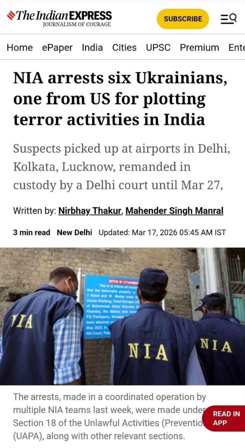 အိန္ဒိယနိုင်ငံအပေါ် အကြမ်းဖက်တိုက်ခိုက်မှုများလုပ်ဆောင်ရန် ပူးပေါင်းကြံစည်မှုဖြင့် ယူကရိန်းနိုင်ငံသား ၆ ဦးနှင့် အမေရိကန်နိုင်ငံသားတစ်ဦးတို့အား အိန္ဒိယနိုင်ငံ အမျိုးသားစုံစမ်းစစ်ဆေးရေးအေဂျင်စီ(NIA)မှ ဖမ်းဆီးထိန်းသိမ်း