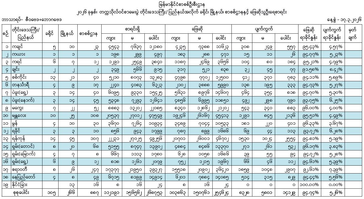 ၂၀၂၆ ခုနှစ် တက္ကသိုလ်ဝင်စာမေးပွဲကို ယခုနှစ်တွင် နိုင်ငံခြားစာစစ်ဌာန ၁၆ ခုနှင့် ပြည်တွင်းစာစစ်ဌာန ၈၇၁ ခု စာစစ်ဌာန စုစုပေါင်း ၈၈၇ ခု ဖွင့်လှစ်ဖြေဆိုခဲ့ရာ စာမေးပွဲဖြေဆိုရန် စာရင်းပေးသွင်းသူဦးရေ စုစုပေါင်း ၂၆၈၇၅၃ ဦးရှိပြီး စာမေးပွဲဆဋ္ဌမနေ့တွင် ဇီဝဗေဒဘာသာရပ်နှင့် ဘောဂဗေဒဘာသာရပ် လာရောက်ဖြေဆိုသူ စုစုပေါင်း ၂၅၄၆၂၄ ဦး၊ ပျက်ကွက် ၁၄၁၂၉ ဦးရှိကာ ဖြေဆိုသူ ၉၄ ဒသမ ၇၄ ရာခိုင်နှုန်းရှိသည်။
