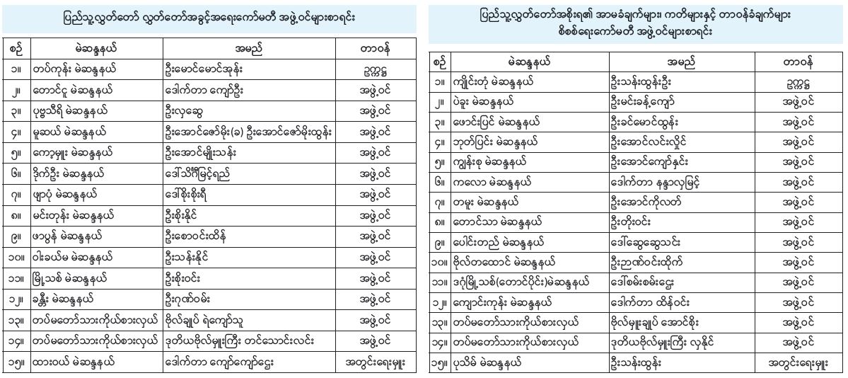 ဆက်လက်၍ ပြည်သူ့ လွှတ်တော်ဥက္ကဋ္ဌက လွှတ်တော်အခွင့်အရေးကော်မတီဖွဲ့စည်းမှုနှင့် ကော်မတီ၏ တာဝန်၊ လုပ်ပိုင်ခွင့်၊ ရပိုင်ခွင့်၊ သက်တမ်း၊ ကော်မတီအစည်းအဝေးတို့နှင့် စပ်လျဉ်းသည့် ရှင်းလင်းတင်ပြချက်များ ကို လွှတ်တော်၏ အတည်ပြုချက်ရယူရာ လွှတ်တော်က သဘောတူသည့်အတွက် လွှတ်တော်အခွင့် အရေးကော်မတီဥက္ကဋ္ဌအဖြစ် တပ်ကုန်းမဲဆန္ဒနယ်မှ ဦးမောင်မောင်အုန်း၊ အတွင်းရေးမှူး အဖြစ် ထားဝယ်မဲဆန္ဒနယ်မှ ဒေါက်တာကျော်ကျော်ဌေးအပါအဝင် အဖွဲ့ဝင် ၁၅ ဦးဖြင့် တာဝန်ပေးအပ်ဖွဲ့စည်းကြောင်းနှင့် လွှတ်တော်အခွင့်အရေးကော်မတီ၏ တာဝန်၊ လုပ်ပိုင်ခွင့်၊ ရပိုင်ခွင့်၊ သက်တမ်းနှင့် ကော်မတီအစည်း အဝေးတို့ကို လွှတ်တော်က အတည်ပြုကြောင်းကြေညာသည်။