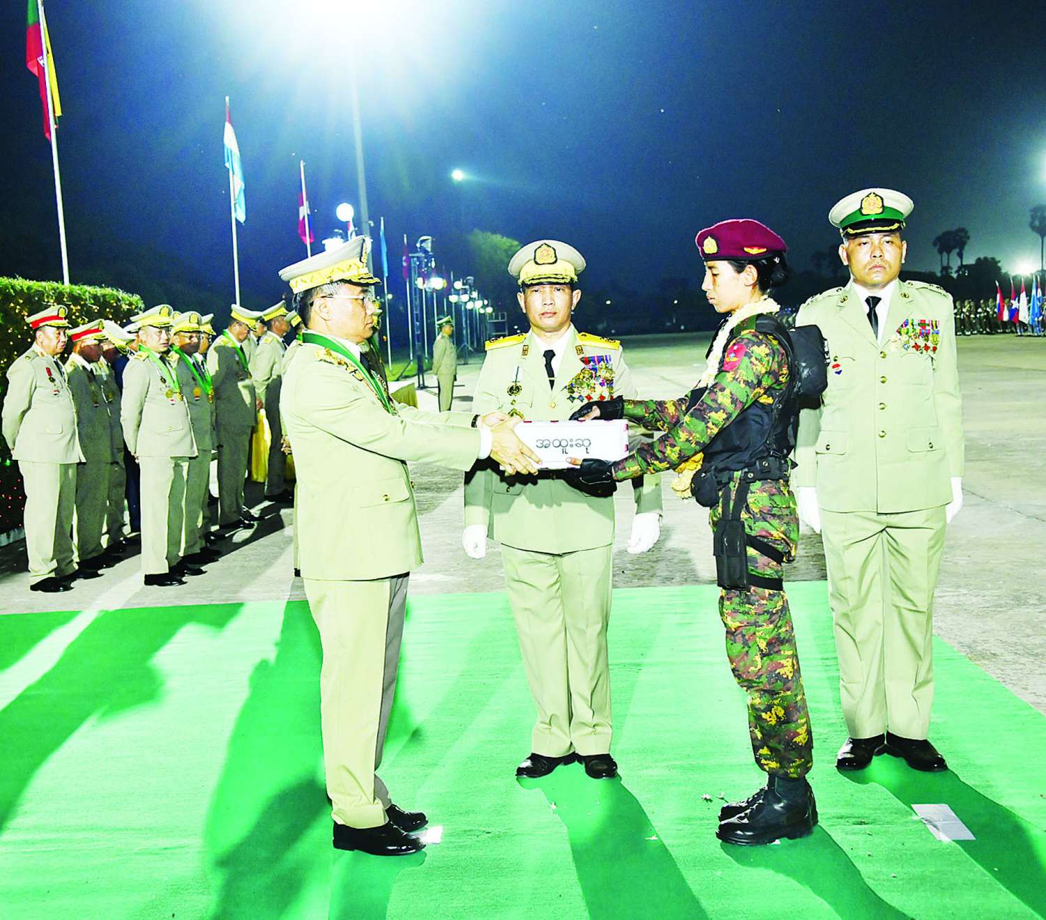 (၈၁) နှစ်မြောက် တပ်မတော်နေ့ စစ်ရေးပြအခမ်းအနားတွင် ဆုရရှိကြသော စစ်ရေးပြတပ်ခွဲများအား ဂုဏ်ပြုဆုချီးမြှင့်ပွဲကို ယနေ့ညပိုင်းတွင် နေပြည်တော်ရှိ စုရပ်သစ်တပ်စစ်ရေးပြကွင်း၌ ကျင်းပပြုလုပ်ရာ နိုင်ငံတော်လုံခြုံရေးနှင့် အေးချမ်းသာယာရေးကော်မရှင်အဖွဲ့ဝင် ညှိနှိုင်းကွပ်ကဲရေးမှူး (ကြည်း၊ ရေ၊ လေ) ဗိုလ်ချုပ်ကြီး ဇေယျကျော်ထင်သရေစည်သူ ကျော်စွာလင်း တက်ရောက်၍ ဆုများကို ပေးအပ်ချီးမြှင့်သည်။