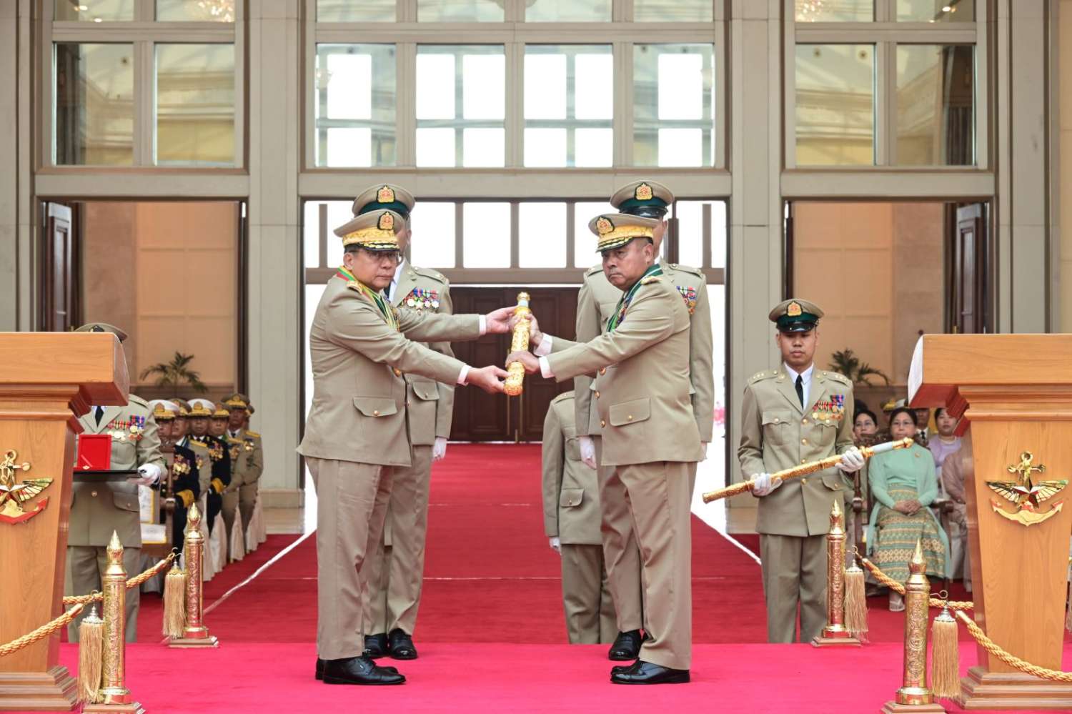 ထို့နောက် လက်ရှိတပ်မတော်ကာကွယ်ရေးဦးစီးချုပ်တာဝန် ထမ်းဆောင်လျက်ရှိသည့် ဗိုလ်ချုပ်မှူးကြီး သတိုးမဟာသရေစည်သူ သတိုးသီရိသုဓမ္မ မင်းအောင်လှိုင်က တပ်မတော်ကာကွယ်ရေးဦးစီးချုပ်တာဝန် လွှဲပြောင်းလက်ခံတာဝန်ထမ်းဆောင်မည့် ကာကွယ်ရေးဦးစီးချုပ် (ကြည်း) ဗိုလ်ချုပ်ကြီး ဇေယျကျော်ထင် စည်သူ ရဲဝင်းဦးထံသို့ တပ်မတော်ကာကွယ်ရေးဦးစီးချုပ်၏ အဆောင်အယောင်ဓားနှင့် တပ်မတော်ကာကွယ်ရေးဦးစီးချုပ်ရုံး၏အလံတို့ကို လွှဲပြောင်းပေးအပ်ပေးပြီး တပ်မတော်ကာကွယ်ရေးဦးစီးချုပ်၏ ဦးစီးကွပ်ကဲမှုတံဆိပ်ကို တပ်ဆင်ပေးသည်။
