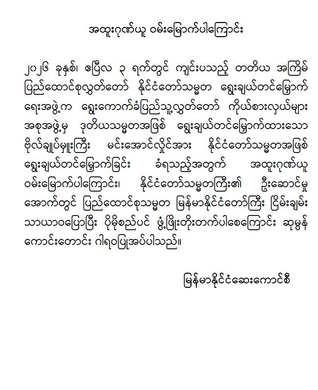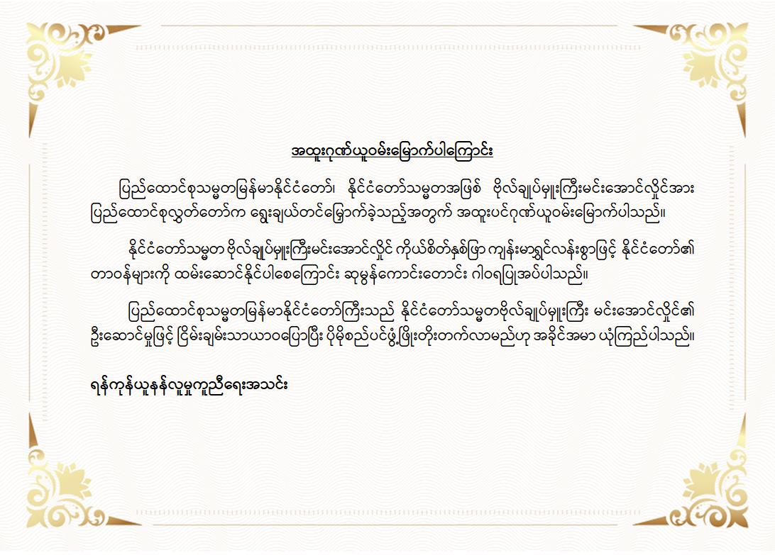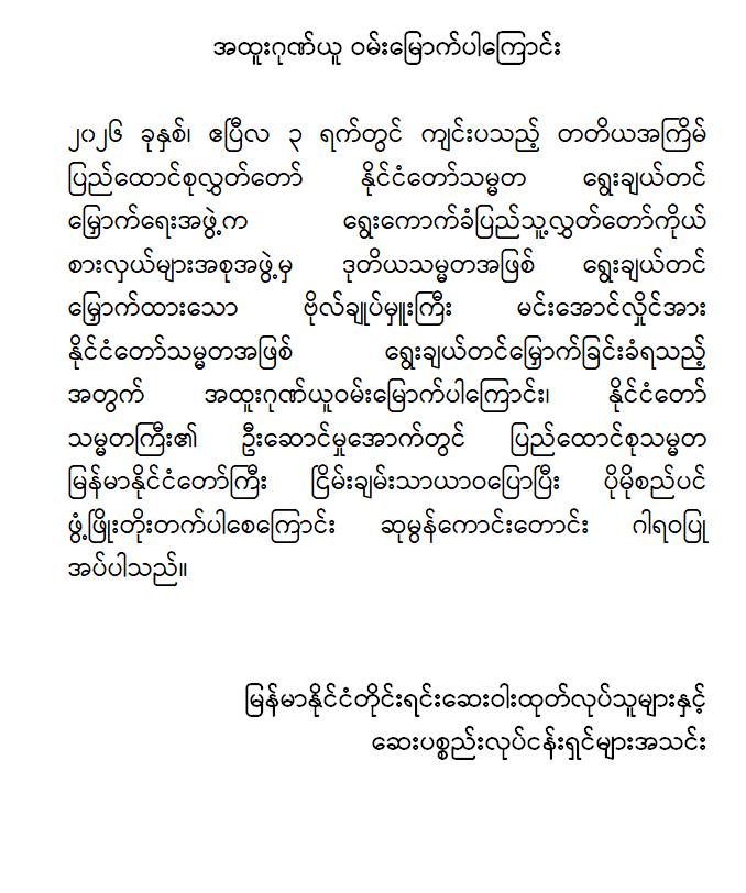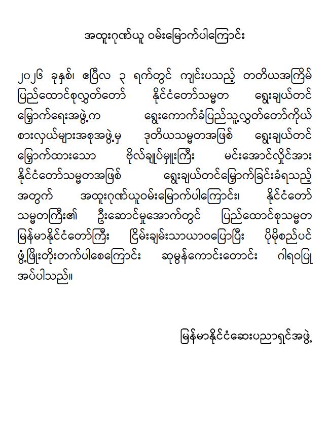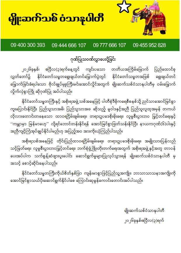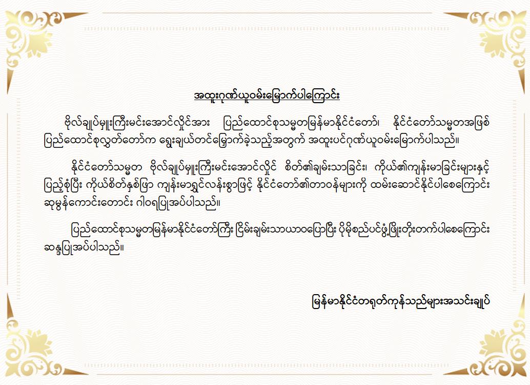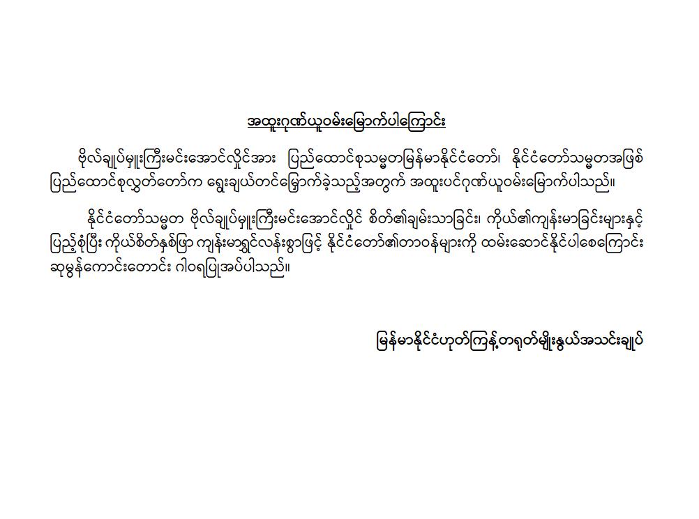 အဆိုပါ ထုတ်ပြန်ကြေညာချက်များတွင် ပြည်ထောင်စုသမ္မတမြန်မာနိုင်ငံတော်၊ နိုင်ငံတော်သမ္မတအဖြစ် ဗိုလ်ချုပ်မှူးကြီး မင်းအောင်လှိုင်အား ပြည်ထောင်စုလွှတ်တော်က ရွေးချယ်တင်မြှောက်ခဲ့သည့်အတွက် အထူးဂုဏ်ယူဝမ်းမြောက်မိပါကြောင်း၊ နိုင်ငံတော်သမ္မတကြီးနှင့် အစိုးရအဖွဲ့သစ်အနေဖြင့် ပါတီစုံဒီမိုကရေစီစနစ်သို့ ညင်သာအောင်မြင်စွာ ကူးပြောင်းနိုင်ပြီး ပြည်သူသာအမိ၊ ပြည်သူသာအဖဆိုသည့် မူဝါဒနှင့်အညီ ပြည်သူလူထုအမှန်တကယ် လိုလားတောင်းတနေသော ထာဝရငြိမ်းချမ်းရေး၊ တရားဥပဒေစိုးမိုးရေး၊ လူမှုစီးပွားဘဝ မြှင့်တင်ရေးနှင့် “ကမ္ဘာမှာ မြန်မာဟေ့” လို့ ရင်ပေါင်တန်းနိုင်ရန် အောင်မြင်စွာဖြတ်သန်းနိုင်ပြီး နာယကဂုဏ်(၆)ပါးနှင့်အညီ ကျင့်ကြံအုပ်ချုပ်နိုင်ပါမည်ဟု အပြည့်အဝအားကိုးယုံကြည်ပါကြောင်း၊ နိုင်ငံတော်သမ္မတ ဗိုလ်ချုပ်မှူးကြီးမင်းအောင်လှိုင် စိတ်၏ချမ်းသာခြင်း၊ ကိုယ်၏ကျန်းမာခြင်းများနှင့်ပြည့်စုံပြီး ကိုယ်စိတ်နှစ်ဖြာကျန်းမာရွှင်လန်းစွာဖြင့် နိုင်ငံတော်၏တာဝန်များကို ထမ်းဆောင်နိုင်ပါစေကြောင်း ဆုမွန်ကောင်းတောင်း ဂါရဝပြုအပ်ပါကြောင်း၊ ပြည်ထောင်စုသမ္မတ မြန်မာနိုင်ငံတော်ကြီး ငြိမ်းချမ်းသာယာဝပြောပြီး ပိုမိုစည်ပင်ဖွံ့ဖြိုး တိုးတက်ပါစေကြောင်း စသည်ဖြင့် ပါရှိကြောင်းသိရှိရသည်။
