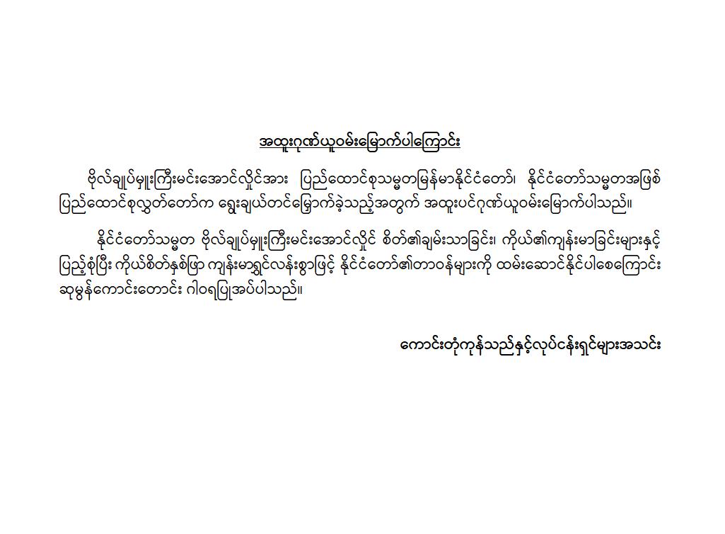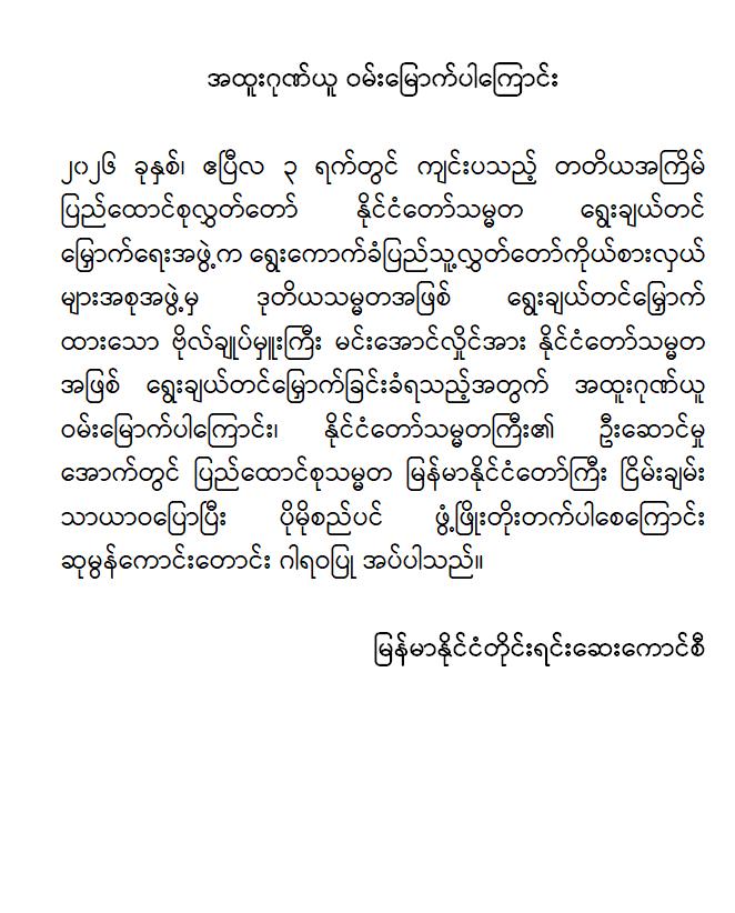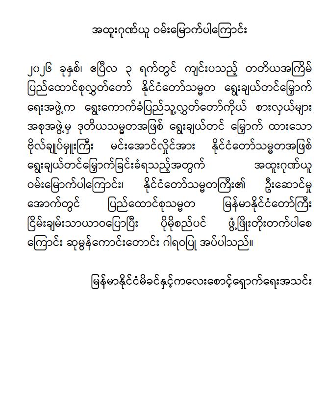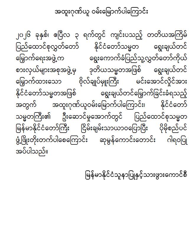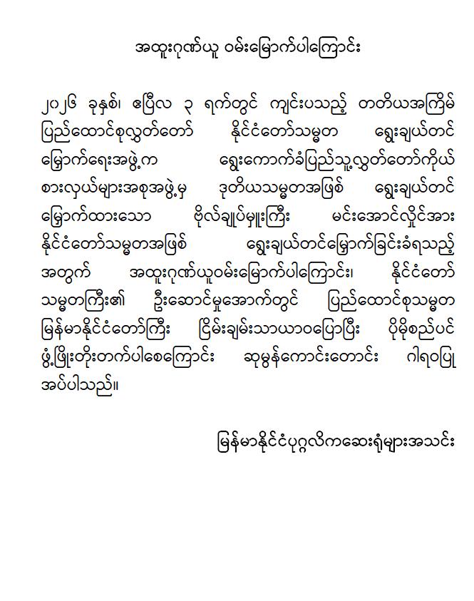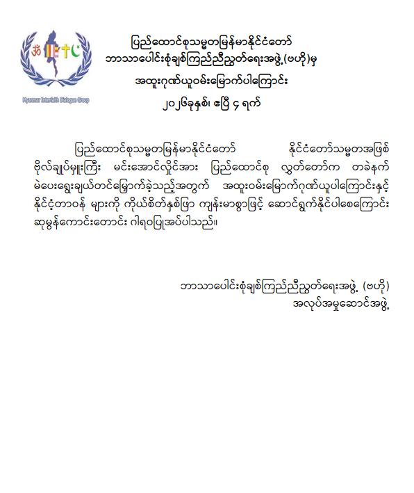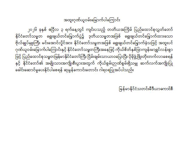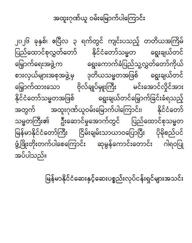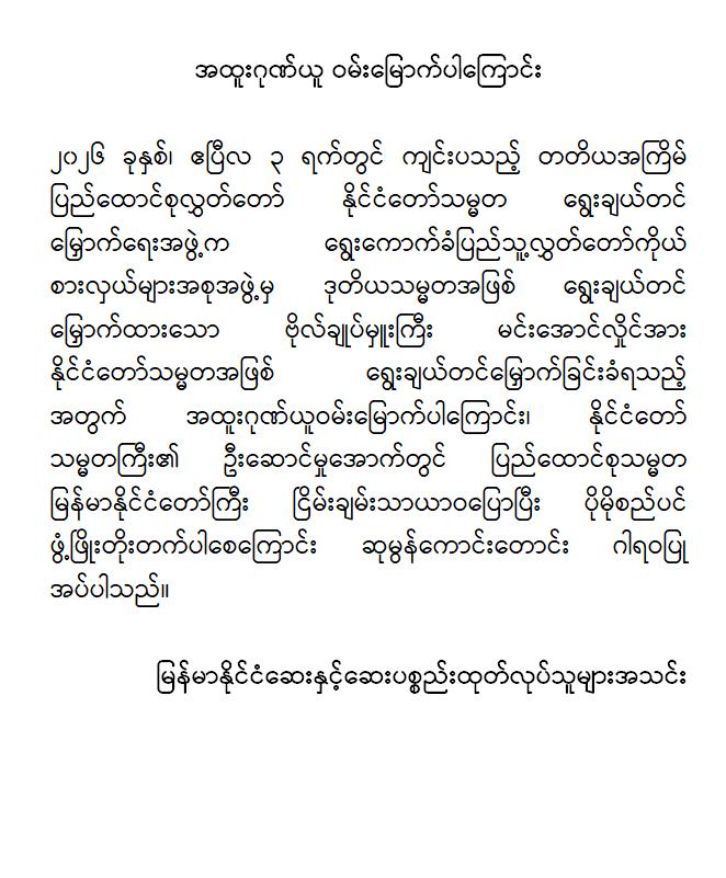 အဆိုပါ ထုတ်ပြန်ကြေညာချက်များတွင် ပြည်ထောင်စုသမ္မတမြန်မာနိုင်ငံတော်၊ နိုင်ငံတော်သမ္မတအဖြစ် ဗိုလ်ချုပ်မှူးကြီး မင်းအောင်လှိုင်အား ပြည်ထောင်စုလွှတ်တော်က ရွေးချယ်တင်မြှောက်ခဲ့သည့်အတွက် အထူးဂုဏ်ယူဝမ်းမြောက်မိပါကြောင်း၊ နိုင်ငံတော်သမ္မတကြီးနှင့် အစိုးရအဖွဲ့သစ်အနေဖြင့် ပါတီစုံဒီမိုကရေစီစနစ်သို့ ညင်သာအောင်မြင်စွာ ကူးပြောင်းနိုင်ပြီး ပြည်သူသာအမိ၊ ပြည်သူသာအဖဆိုသည့် မူဝါဒနှင့်အညီ ပြည်သူလူထုအမှန်တကယ် လိုလားတောင်းတနေသော ထာဝရငြိမ်းချမ်းရေး၊ တရားဥပဒေစိုးမိုးရေး၊ လူမှုစီးပွားဘဝ မြှင့်တင်ရေးနှင့် “ကမ္ဘာမှာ မြန်မာဟေ့” လို့ ရင်ပေါင်တန်းနိုင်ရန် အောင်မြင်စွာဖြတ်သန်းနိုင်ပြီး နာယကဂုဏ်(၆)ပါးနှင့်အညီ ကျင့်ကြံအုပ်ချုပ်နိုင်ပါမည်ဟု အပြည့်အဝအားကိုးယုံကြည်ပါကြောင်း၊ နိုင်ငံတော်သမ္မတ ဗိုလ်ချုပ်မှူးကြီးမင်းအောင်လှိုင် စိတ်၏ချမ်းသာခြင်း၊ ကိုယ်၏ကျန်းမာခြင်းများနှင့်ပြည့်စုံပြီး ကိုယ်စိတ်နှစ်ဖြာကျန်းမာရွှင်လန်းစွာဖြင့် နိုင်ငံတော်၏တာဝန်များကို ထမ်းဆောင်နိုင်ပါစေကြောင်း ဆုမွန်ကောင်းတောင်း ဂါရဝပြုအပ်ပါကြောင်း၊ ပြည်ထောင်စုသမ္မတ မြန်မာနိုင်ငံတော်ကြီး ငြိမ်းချမ်းသာယာဝပြောပြီး ပိုမိုစည်ပင်ဖွံ့ဖြိုး တိုးတက်ပါစေကြောင်း စသည်ဖြင့် ပါရှိကြောင်းသိရှိရသည်။