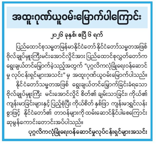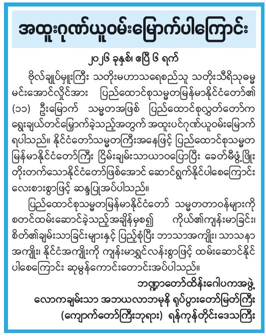အဆိုပါထုတ်ပြန်ကြေညာချက်များတွင် ပြည်ထောင်စုသမ္မတမြန်မာနိုင်ငံတော် နိုင်ငံတော်သမ္မတအဖြစ် ဗိုလ်ချုပ်မှူးကြီး မင်းအောင်လှိုင်အား ပြည်ထောင်စုလွှတ်တော်က ရွေးချယ်တင်မြှောက်ခဲ့သည့်အတွက် အထူးဂုဏ်ယူဝမ်းမြောက်မိပါကြောင်း၊ မြန်မာနိုင်ငံတော်ကြီး ငြိမ်းချမ်းသာယာဝပြောပြီး ခေတ်မီဖွံ့ဖြိုးတိုးတက်သော နိုင်ငံတော်ဖြစ်အောင် ဆောင်ရွက်နိုင်ပါစေကြောင်း၊ ကိုယ်စိတ်နှစ်ဖြာကျန်းမာ၊ ချမ်းသာစွာဖြင့် ပြည်သူများ၏ အကျိုးအတွက် နိုင်ငံ့တာဝန်များကို ထမ်းဆောင်နိုင်ပါစေကြောင်း၊ ဘာသာအကျိုး၊ သာသနာအကျိုး၊ နိုင်ငံအကျိုးကို ဆတက်ထမ်းပိုး သယ်ပိုးထမ်းရွက်နိုင်ပါစေကြောင်း၊ သမ္မတကြီး၏ ဦးဆောင်မှုဖြင့် ပြည်ထောင်စုသမ္မတမြန်မာနိုင်ငံတော်ကြီး ငြိမ်းချမ်းသာယာပြီး ပိုမိုစည်ပင်ဖွံ့ဖြိုးတိုးတက်ပါစေကြောင်း၊ နိုင်ငံတော်ကို တည်ငြိမ်အေးချမ်းစေပြီး ပြည်သူအများ ချမ်းသာကြွယ်ဝကာ နိုင်ငံ့စီးပွားထွန်းကားလျက် အခြေအနေသစ်များနှင့် အသစ်သောအသွင်ကူးပြောင်းမှုများဖြင့် ကောင်းမွန်ပြည့်စုံပါစေကြောင်း စသည်ဖြင့် ပါရှိကြောင်း သိရှိရသည်။