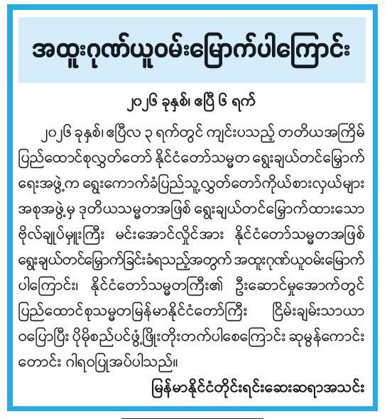 ၂၀၂၆ ခုနှစ်၊ ဧပြီလ ၃ ရက်တွင် ကျင်းပသည့် နိုင်ငံတော်သမ္မတရွေးချယ်တင်မြှောက်ပွဲ၌ ပြည်ထောင်စုလွှတ်တော်ကိုယ်စားလှယ်အားလုံးပါဝင်သော နိုင်ငံတော်သမ္မတရွေးချယ်တင်မြှောက်ရေးအဖွဲ့က ရွေးကောက်ခံ ပြည်သူ့လွှတ်တော်ကိုယ်စားလှယ်များအစုအဖွဲ့မှ ဒုတိယသမ္မတအဖြစ် ရွေးချယ်တင်မြှောက်ထားသော ဗိုလ်ချုပ်မှူးကြီး မင်းအောင်လှိုင်အား နိုင်ငံတော်သမ္မတအဖြစ် ရွေးချယ်တင်မြှောက်ခြင်းခံရသည့်အတွက် လောကချမ်းသာ အဘယလာဘမုနိရုပ်ပွားတော်မြတ်ကြီး (ကျောက်တော်ကြီးဘုရား) ဘဏ္ဍာတော်ထိန်းဂေါပကအဖွဲ့၊ မြန်မာနိုင်ငံလုံးဆိုင်ရာ MSME Cluster ဖိနပ်လုပ်ငန်းရှင်များဗဟိုအဖွဲ့ချုပ်၊ မြန်မာနိုင်ငံဆိုင်ရာ ရှန်ရှီးကုန်သည်ကြီးများအသင်းချုပ်၊ မြန်မာ-ဘယ်လာရုစ် ချစ်ကြည်ရေးနှင့် ပူးပေါင်းဆောင်ရွက်မှုတိုးမြှင့်ရေးအသင်း၊ မြန်မာနိုင်ငံတိုင်းရင်းဆေးဆရာအသင်း၊ မြန်မာပြည် တရုတ်ဗုဒ္ဓဘာသာရဟန်းတော်များအဖွဲ့၊ မဇ္ဈိမာလင်္ကာရသာမဏေကျော်အသင်း၊ ပုဂ္ဂလိကလုံခြုံရေးဝန်ဆောင်မှုလုပ်ငန်းရှင်များအသင်း၊ ထားဝယ်လူမျိုးစုစည်းမှုကော်မတီ (ဗဟို) တို့က အထူးဂုဏ်ယူဝမ်းမြောက်ကြောင်း ကြေညာချက်များ ထုတ်ပြန်ခဲ့ကြသည်။
