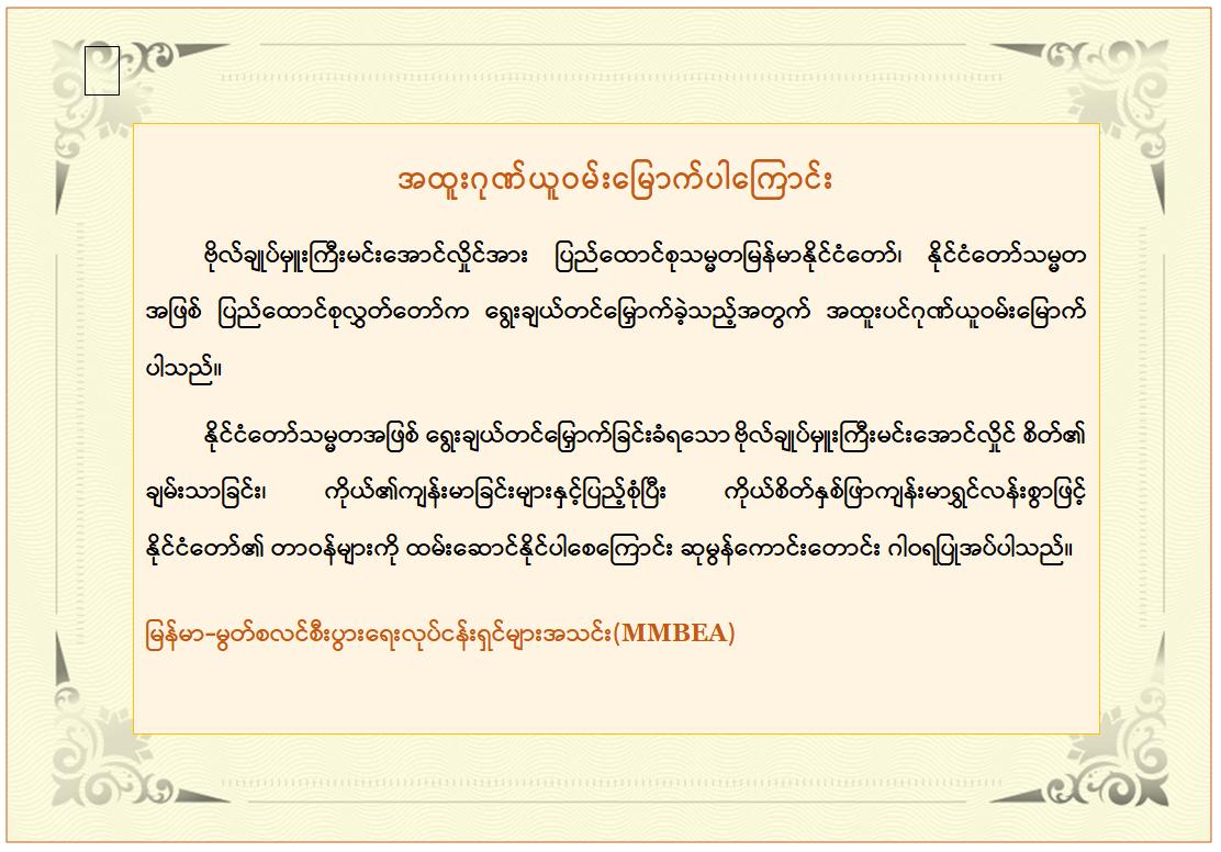 ၂၀၂၆ ခုနှစ်၊ ဧပြီလ ၃ ရက်တွင် ကျင်းပသည့် နိုင်ငံတော်သမ္မတ ရွေးချယ်တင်မြှောက်ပွဲ၌ ပြည်ထောင်စုလွှတ်တော်ကိုယ်စားလှယ် အားလုံးပါဝင်သော နိုင်ငံတော်သမ္မတ ရွေးချယ်တင်မြှောက်ရေးအဖွဲ့က ရွေးကောက်ခံပြည်သူ့လွှတ်တော်ကိုယ်စားလှယ်များ အစုအဖွဲ့မှ ဒုတိယသမ္မတအဖြစ် ရွေးချယ်တင်မြှောက်ထားသော ဗိုလ်ချုပ်မှူးကြီး မင်းအောင်လှိုင်အား နိုင်ငံတော်သမ္မတအဖြစ် ရွေးချယ်တင်မြှောက်ခြင်းခံရသည့်အတွက် မြန်မာအမျိုးသမီးစီးပွားရေးစွမ်းဆောင်ရှင်များအသင်း (ဗဟို)၊ မြန်မာနိုင်ငံအမျိုးသမီးအားကစားအဖွဲ့ချုပ်၊ မြန်မာနိုင်ငံရိုးရာပန်းပညာရှင်များအစည်းအရုံး၊ မြန်မာ-မွတ်စလင် စီးပွားရေးလုပ်ငန်းရှင်များအသင်း (MMBEA) နှင့် ရန်ကုန်တိုင်းဒေသကြီး၊ ဇဖာရ်ရှားဂူဗိမ္မာန်ကြီးကြပ်ရေးကော်မတီတို့က အထူးဂုဏ်ယူဝမ်းမြောက်ကြောင်း ကြေညာချက်များ ထုတ်ပြန်ခဲ့ကြသည်။