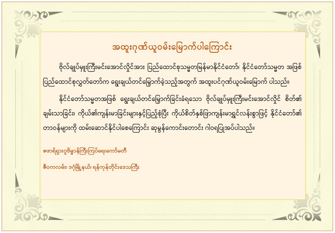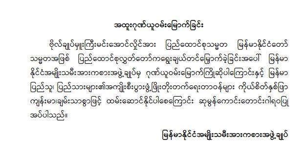 အဆိုပါထုတ်ပြန်ကြေညာချက်များတွင် ပြည်ထောင်စုသမ္မတ မြန်မာနိုင်ငံတော် နိုင်ငံတော်သမ္မတအဖြစ် ဗိုလ်ချုပ်မှူးကြီး မင်းအောင်လှိုင်အား ပြည်ထောင်စုလွှတ်တော်က ရွေးချယ်တင်မြှောက်ခဲ့သည့်အတွက် အထူးလှိုက်လှဲစွာ ဂုဏ်ယူဝမ်းမြောက်ပါကြောင်း၊ မြန်မာပြည်သူ၊ ပြည်သားများ၏ အကျိုးစီးပွားဖွံ့ဖြိုးတိုးတက်ရေးတာဝန်များ ကိုယ်စိတ်နှစ်ဖြာကျန်းမာ၊ ချမ်းသာစွာဖြင့် ထမ်းဆောင်နိုင်ပါစေကြောင်း၊ နိုင်ငံတော်သမ္မတကြီး၏ ဦးဆောင်မှုအောက်တွင် ပြည်ထောင်စုသမ္မတမြန်မာနိုင်ငံတော်ကြီး ငြိမ်းချမ်းသာယာဝပြော၍ ပိုမိုစည်ပင်ဖွံ့ဖြိုးတိုးတက်ပါစေကြောင်း စသည်ဖြင့် ပါရှိကြောင်း သိရှိရသည်။