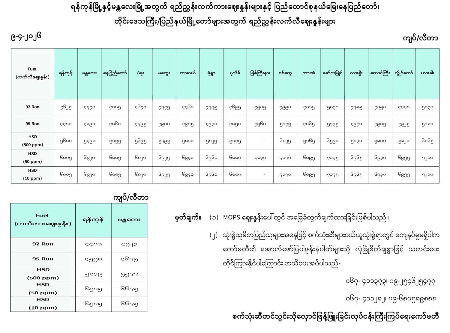 ရန်ကုန်မြို့နှင့် မန္တလေးမြို့အတွက် ရည်ညွှန်းလက်ကားဈေးနှုန်းများနှင့် ပြည်ထောင်စုနယ်မြေ နေပြည်တော်၊ တိုင်းဒေသကြီး/ပြည်နယ် မြို့တော်များအတွက် ရည်ညွှန်းလက်လီဈေးနှုန်းများ 04/09/2026