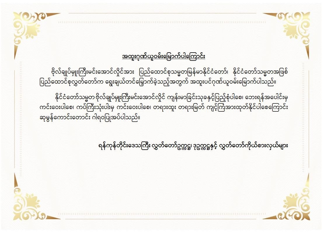 အဆိုပါ ထုတ်ပြန်ကြေညာချက်များတွင် ပြည်ထောင်စုသမ္မတမြန်မာနိုင်ငံတော် နိုင်ငံတော်သမ္မတအဖြစ် ဗိုလ်ချုပ်မှူးကြီးမင်းအောင်လှိုင်အား ပြည်ထောင်စုလွှတ်တော်က ရွေးချယ်တင်မြှောက်ခဲ့သည့်အတွက် အထူးလှိုက်လှဲစွာဂုဏ်ယူဝမ်းမြောက်ပါကြောင်း၊ နိုင်ငံတော်သမ္မတ ဗိုလ်ချုပ်မှူးကြီးမင်းအောင်လှိုင် စိတ်၏ချမ်းသာခြင်း၊ ကိုယ်၏ကျန်းမာခြင်းများနှင့်ပြည့်စုံပြီး ကိုယ်စိတ်နှစ်ဖြာကျန်းမာရွှင်လန်းစွာဖြင့် နိုင်ငံတော်၏ အကျိုး၊ အမျိုးဘာသာ သာသနာအကျိုးတို့ကို ဆတက်ထမ်းပိုး သယ်ပိုးဆောင်ရွက်နိုင်ပါစေကြောင်း၊ သမ္မကြီးဦးဆောင်မှုအောက်တွင် မြန်မာနိုင်ငံ၏ စီးပွားရေးကဏ္ဍများ၊ အထူးသဖြင့် အသေးစား၊ အငယ်စား၊ အလတ်စား စီးပွားရေးလုပ်ငန်းကဏ္ဍသည် ပိုမိုတိုးတက်ဖွံ့ဖြိုးလာမည်ဟု မျှော်လင့်ပါကြောင်း၊ ကျန်းမာခြင်းသုခနှင့် ပြည့်စုံပါစေ၊ ဘေးရန်အပေါင်းမှ ကင်းဝေးပါစေ၊ ကပ်ကြီးသုံးပါးမှ ကင်းဝေးပါစေကြောင်းစသည်ဖြင့် ပါရှိကြောင်း သိရှိရသည်။