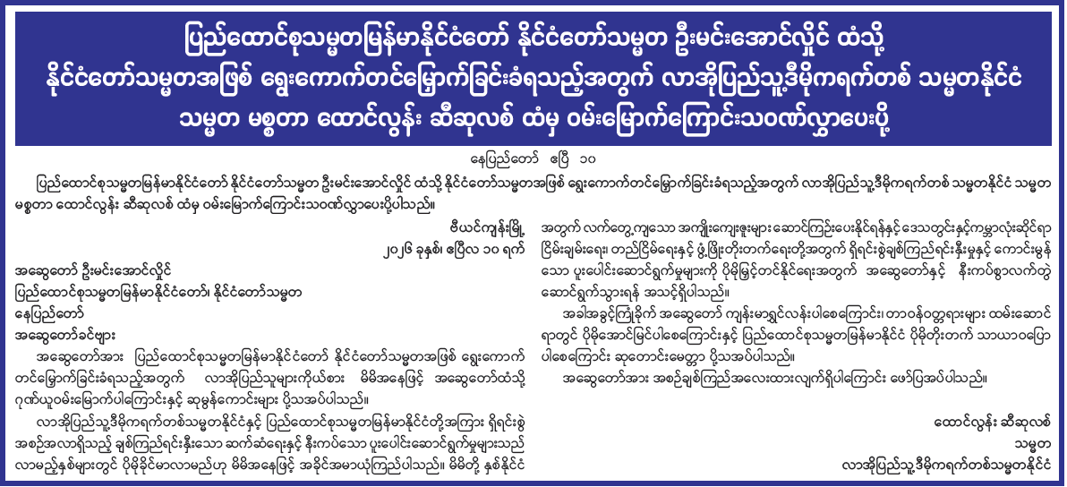 ပြည်ထောင်စုသမ္မတမြန်မာနိုင်ငံတော် နိုင်ငံတော်သမ္မတ ဦးမင်းအောင်လှိုင်ထံသို့ နိုင်ငံတော်သမ္မတအဖြစ် ရွေးကောက်တင်မြှောက်ခြင်းခံရသည့်အတွက် လာအိုပြည်သူ့ဒီမိုကရက်တစ် သမ္မတနိုင်ငံ သမ္မတ မစ္စတာ ထောင်လွန်း ဆီဆုလစ်ထံမှ ဝမ်းမြောက်ကြောင်းသဝဏ်လွှာပေးပို့
