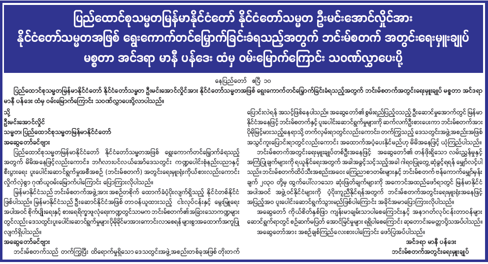 ပြည်ထောင်စုသမ္မတမြန်မာနိုင်ငံတော် နိုင်ငံတော်သမ္မတ ဦးမင်းအောင်လှိုင်အား နိုင်ငံတော်သမ္မတအဖြစ် ရွေးကောက်တင်မြှောက်ခြင်းခံရသည့်အတွက် ဘင်းမ်စတက် အတွင်းရေးမှူးချုပ် မစ္စတာ အင်ဒရာ မာနီ ပန်ဒေး ထံမှ ဝမ်းမြောက်ကြောင်း သဝဏ်လွှာပေးပို့