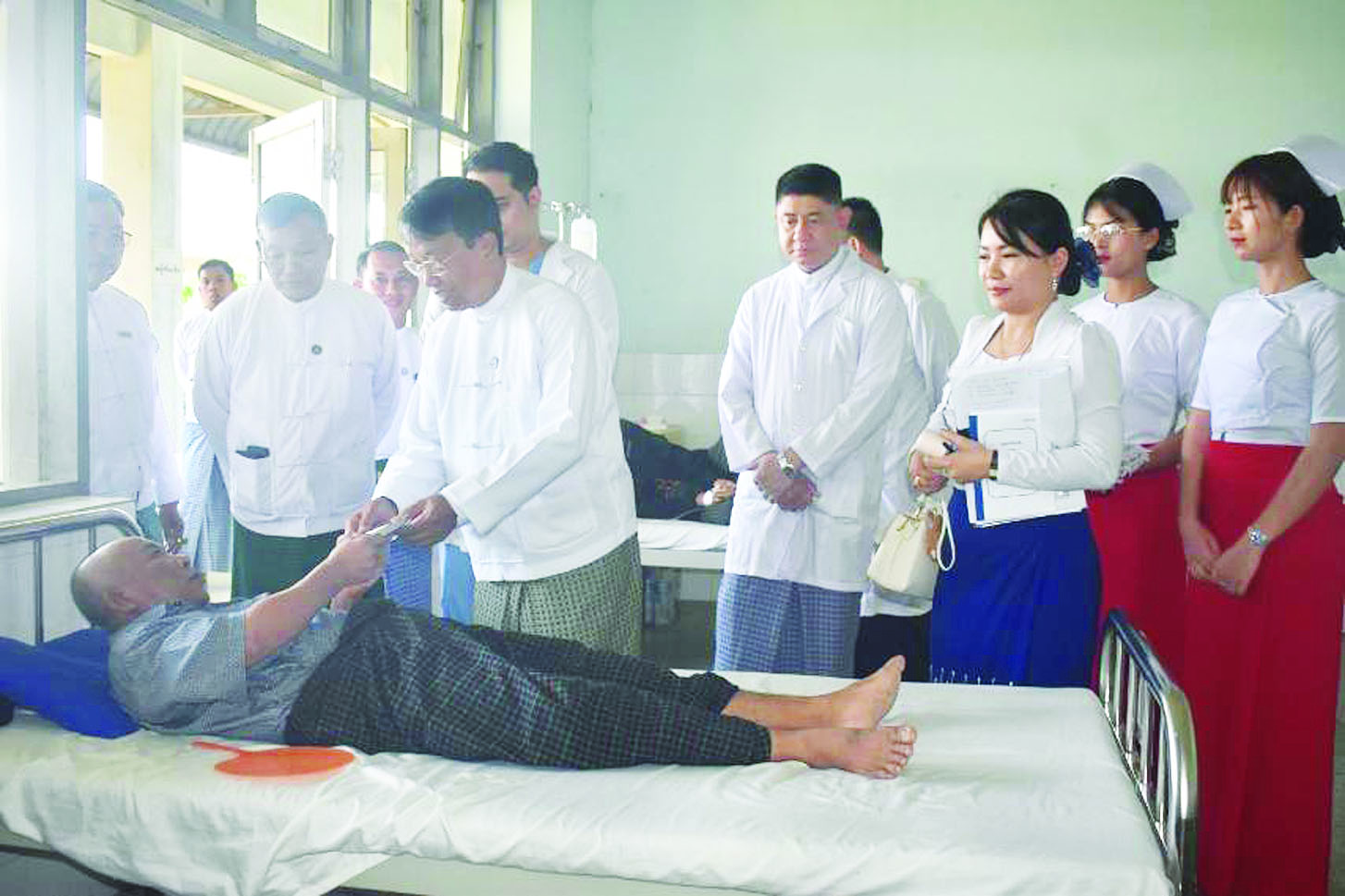 ထို့နောက် ပြည်ထောင်စုဝန်ကြီးသည် ဆေးရုံအတွင်း လှည့်လည်ကြည့်ရှုခဲ့ပြီး ဆေးဝါးကုသမှုခံယူနေသည့် အာမခံအလုပ်သမားများကို ရင်းရင်းနှီးနှီးတွေ့ဆုံအားပေးကာ ထောက်ပံ့ငွေများ ပေးအပ်သည်။