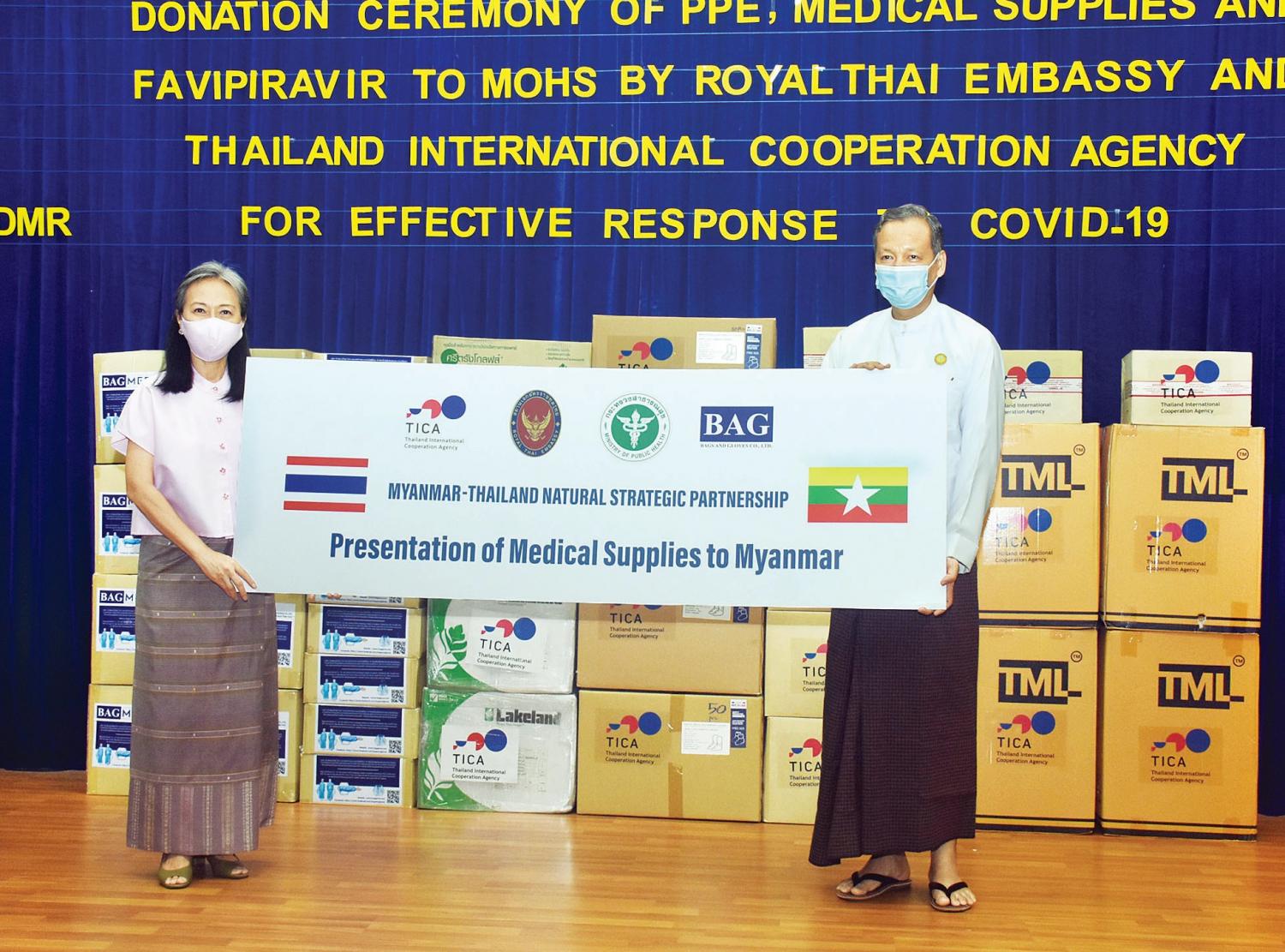 လတ်တလော အသက်ရှူ လမ်းကြောင်းဆိုင်ရာ ကိုဗစ်-၁၉ ရောဂါ ကာကွယ်နိုင်ရန်အတွက် ကျန်းမာရေးနှင့် အားကစားဝန်ကြီး ဌာနသို့ မြန်မာနိုင်ငံဆိုင်ရာ ထိုင်း နိုင်ငံသံရုံးနှင့် Thailand Inernational Cooperation Agency တို့က ထိုင်း ဘတ်ငွေ ၇၈၈၀၀၀ နှင့် ညီမျှသော PPE ဝတ်စုံများ၊ ဆေးဘက်ဆိုင်ရာ ပစ္စည်းများနှင့် FAVIPIRAVIR ဆေး များကို လှူဒါန်းခဲ့ခြင်းဖြစ်ကြောင်း သိရသည်။