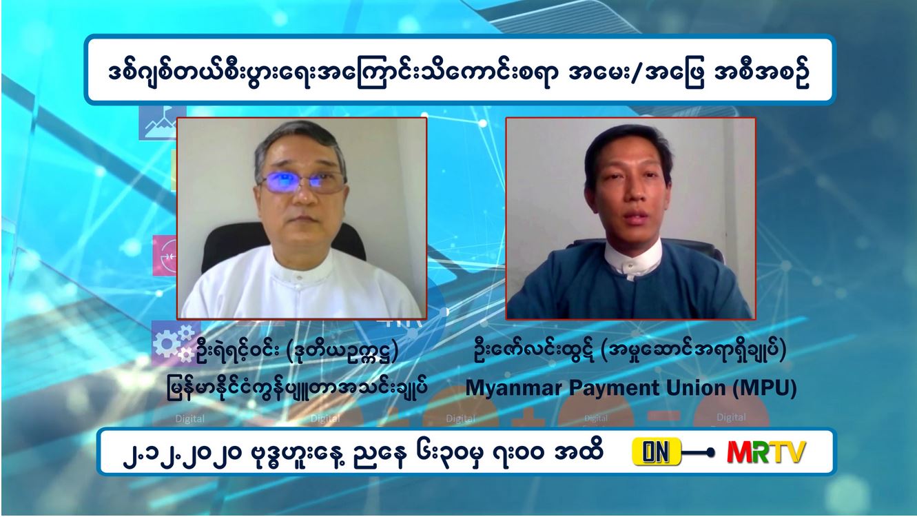 ဒီဇင်ဘာ ၂ ရက် ဗုဒ္ဓဟူးနေ့ ညနေတွင် မြန်မာနိုင်ငံ၏ Digital အသွင်ပြောင်းမှုမှာ အဓိက အရေးပါသည့် အခန်းကဏ္ဍမှာ ပါဝင်နေသည့် ဒစ်ဂျစ်တယ် ငွေပေးချေမှုစနစ်  အသုံးပြုပြီး ဝန်ဆောင်မှုများ မြန်ဆန်လာအောင် ဆောင်ရွက်နိုင်ရန်အတွက် ဗဟုသုတ မျှဝေပေးမည့် ဒစ်ဂျစ်တယ် စီးပွားရေးအကြောင်း သိကောင်းစရာ အစီအစဉ်နှင့် စပ်လျဉ်း၍ မြန်မာနိုင်ငံ ကွန်ပျူတာအသင်းချုပ် ဒုတိယဥက္ကဋ္ဌ ဦးရဲရင့်ဝင်းနှင့် Myanmar Payment Union (MPU) အမှုဆောင်အရာရှိချုပ် ဦးဇော်လင်းထွဋ် တို့၏  ဆွေးနွေးချက်များကို ထုတ်လွှင့်သွားမည် ဖြစ်ကြောင်း သိရသည်။