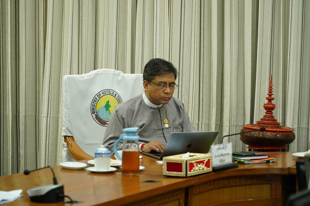 ထို့နောက် ဟိုတယ်နှင့်ခရီးသွားလာရေးဝန်ကြီးဌာန ပြည်ထောင်စုဝန်ကြီး ဦးအုန်းမောင်က ကိုဗစ်-၁၉ ကြောင့် ရပ်ဆိုင်း သွားသော ခရီးသွားလုပ်ငန်း ပြန်လည်စတင်နိုင်ရန်နှင့် ပြန်လည်ဦးမော့လာစေရန်အတွက် မိမိတို့ဝန်ကြီးဌာနမှ ကိုဗစ်-၁၉ ဆိုင်ရာ ခရီးသွားလုပ်ငန်း ကုစားမှု အစီအစဉ် (COVID-19 Tourism Relief Plan) နိုင်ငံတော်မှ ထုတ်ပြန်ထားရှိသည့် COVID-19 Economic Relief Plan(CERP) အပေါ် အခြေခံကာ ရေးဆွဲထုတ်ပြန်ခဲ့ပြီးဖြစ်ပါကြောင်း၊ ကိုဗစ်-၁၉ ဆိုင်ရာ ခရီးသွားလုပ်ငန်း ကုစားမှု အစီအစဉ်တွင် ပါဝင်သည့် လုပ်ငန်းစဉ်များအရ ခရီးသွားလုပ်ငန်း ဆောင်ရွက်ရာတွင် ခရီးသွားများ၊ ခရီးသွားများကို ဝန်ဆောင်မှုပေးမည့် ဝန်ထမ်းများ ကျန်းမာစေရန်နှင့် ဘေးအန္တရာယ် ကင်းရှင်းစေရန် လိုအပ်ပါကြောင်း။ ထို့ကြောင့် ကျန်းမာရေး နှင့် အားကစားဝန်ကြီးဌာန၊ ပို့ဆောင်ရေးနှင့်ဆက်သွယ်ရေးဝန်ကြီးဌာန၊ သာသနာရေးနှင့် ယဉ်ကျေးမှု ဝန်ကြီးဌာနနှင့် မိမိတို့ ဝန်ကြီးဌာနတို့မှ ထုတ်ပြန်ထားသော လမ်းညွှန်မှုများကို စုစည်းပြီး National Tourism Guidelines ကို ထုတ်ပြန်ခဲ့ပါကြောင်း၊ တိုင်းဒေသကြီးနှင့် ပြည်နယ်အသီးသီးရှိ ဒေသဆိုင်ရာ ခရီးသွားလုပ်ငန်း ကော်မတီများမှ ခရီးသွားလုပ်ငန်း ပြန်လည် စတင်ခွင့်ပြုပေးသည့် အချိန်တွင် ထုတ်ပြန်ထားသော Guidelines များနှင့် ကိုက်ညီမှုကို တာဝန်ရှိ သူ များက ပူးပေါင်း စိစစ်ပြီး Regional အဆင့်တွင့် ဖွင့်လှစ် ခွင့်ပြုပေးခဲ့ပါကြောင်း မြန်မာနိုင်ငံကို safe to travel destination တစ်ခုအဖြစ် နိုင်ငံတကာ ခရီးသွားများက သိမြင်လက်ခံလာအောင် ဆောင်ရွက်ရန် လိုအပ်သည့်အတွက် ကျန်းမာရေး နှင့်အားကစား ဝန်ကြီးဌာနနှင့် ပူးပေါင်းကာ “Enchanting Myanmar Health and Safety Protocol” ကို ပြုစုရေးဆွဲ ခဲ့ပါကြောင်း၊ Regional အဆင့် ဖွင့်လှစ် ခွင့်ပြုရာတွင် အသုံးပြုခဲ့သည့် National Tourism Guidelines များ ကျင့်သုံးနိုင်ရန် စနစ်တကျနှင့် ကျယ်ကျယ်ပြန့်ပြန့် သင်တန်းများပေးရန်နှင့် လိုက်နာကျင့်သုံးမှုကို အခါအားလျော်စွာ ပုံမှန်စစ်ဆေးအသိ အမှတ်ပြုရန် ဖြစ်ပါကြောင်း၊ ထိုသို့သင်တန်းများပေးရန်နှင့် စစ်ဆေးမှုများကို အလုပ်သမား၊ လူဝင်မှုကြီးကြပ်ရေးနှင့် ပြည်သူ့အင်အားဝန်ကြီးဌာန၊ အပြည်ပြည်ဆိုင်ရာ အလုပ်သမားရေးရာ အဖွဲ့အစည်း၊ မြန်မာနိုင်ငံလုပ်သားများ ကျွမ်းကျင်မှု ‘စံ’ သတ်မှတ်ပြဋ္ဌာန်းရေးအဖွဲ့၊ မြန်မာနိုင်ငံ ဟိုတယ်နှင့် ခရီးသွားလုပ်ငန်းဆိုင်ရာ ကျွမ်းကျင်ပညာရှင်များအသင်းတို့နှင့် ပူးပေါင်းပြုလုပ် သွားမည်ဖြစ်ကာ လိုအပ်သည့်သင်တန်းဆရာနှင့် စစ်ဆေးရေးမှူးများကို အမျိုးသားအဆင့် မွေးထုတ် ပေးသွားမည် ဖြစ်ပါကြောင်း။