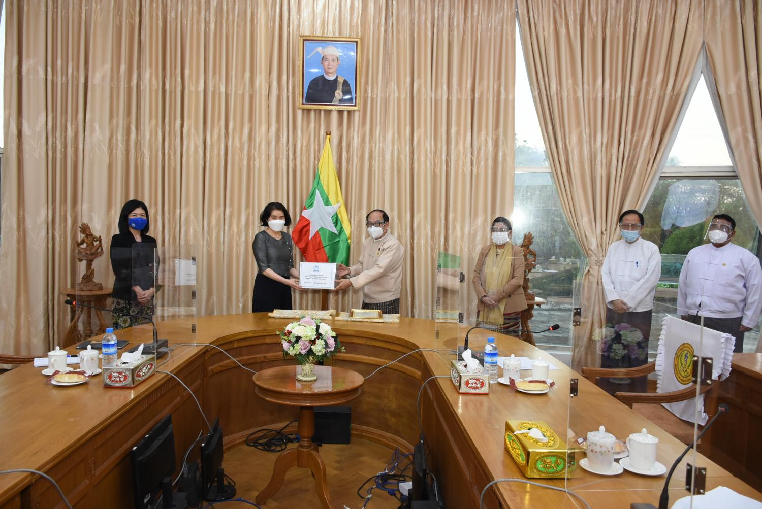 ကျန်းမာရေးနှင့်အားကစားဝန်ကြီးဌာန ပြည်ထောင်စုဝန်ကြီးဒေါက်တာမြင့်ထွေးသည် ယနေ့ ညနေပိုင်းတွင် ကုလသမဂ္ဂဒုက္ခသည်များဆိုင်ရာ မဟာမင်းကြီးရုံး (UNHCR) ၏ မြန်မာနိုင်ငံဆိုင်ရာ ကိုယ်စားလှယ် Ms. Hai Kyung Jun အား လက်ခံတွေ့ဆုံပြီး ကုလသမဂ္ဂဒုက္ခသည်များဆိုင်ရာ မဟာမင်းကြီးရုံး (UNHCR) မှ လှူဒါန်းသည့် ကိုဗစ်-၁၉ ဓာတ်ခွဲမှု PCR Test Kit များအား လက်ခံသည်။