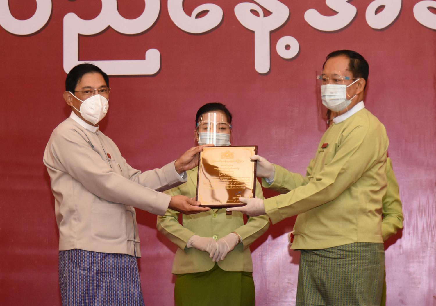 ထို့နောက် ပြည်ထောင်စုဝန်ကြီး ဦးမင်းသူက ကိုဗစ်-၁၉ ရောဂါ ကာကွယ် ထိန်းချုပ်၊ တုံ့ပြန်ရေး လုပ်ငန်းစဉ်များအား စွမ်းစွမ်းတမံ ကူညီဆောင်ရွက်ခဲ့သည့် အစိုးရအဖွဲ့ရေးရာ ဌာနကိုယ်စား ဒုတိယညွှန်ကြားရေးမှူးချုပ် ဦးအောင်စိုးသိန်း ကိုလည်းကောင်း၊ ကိုဗစ်-၁၉ ရောဂါ ကာကွယ်ထိန်းချုပ်၊ တုံ့ပြန်ရေး လုပ်ငန်းစဉ်များနှင့် အထွေထွေရွေးကောက်ပွဲ အောင်မြင်စွာ ကျင်းပပြုလုပ်နိုင်ရေးနှင့် စပ်လျဉ်းသည့် အုပ်ချုပ်ရေးလုပ်ငန်းစဉ်များကို စွမ်းစွမ်းတမံပံ့ပိုးကူညီ ဆောင်ရွက်ခဲ့သည့် အထွေထွေအုပ်ချုပ်ရေးဦးစီးဌာနကိုယ်စား ညွှန်ကြားရေးမှူးချုပ် ဦးမြင့်သန်းကို လည်းကောင်း၊ ကိုဗစ်-၁၉ ရောဂါ ကာကွယ်၊ ထိန်းချုပ်၊ တုံ့ပြန်ရေးလုပ်ငန်းစဉ်များအား ကူညီဆောင်ရွက်ခဲ့သည့် အခွန်အယူခံခုံအဖွဲ့ရုံးကိုယ်စား ညွှန်ကြားရေးမှူးချုပ် ဦးအောင်မြင့်လွင်အား လည်းကောင်း ဂုဏ်ပြုဆုတံဆိပ်များ ပေးအပ်ချီးမြှင့်သည်။