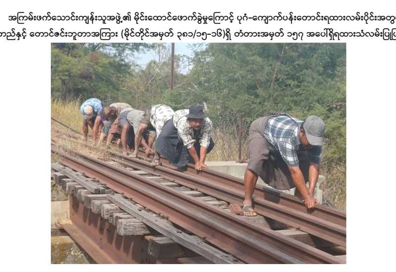မန္တလေးတိုင်းဒေသကြီး၊ ညောင်ဦးမြို့နယ်၊ ပုဂံ-ကျောက်ပန်းတောင်းလမ်းပိုင်းအတွင်း စုတည်ဘူတာနှင့် တောင်ဇင်းဘူတာအကြား သံလမ်းပြေးယာဉ် RGC 103 ဖြင့် ရထားလမ်းပိုင်းအား ယနေ့နံနက် ၈ နာရီ ၅၀ မိနစ်ခန့်တွင် သွားရောက်စစ်ဆေးစဉ် မိုင်တိုင် ၃၈၁/၁၅-၁၆ ကြား ပေ ၂၀ အရှည်ရှိ သံဘောင်တံတားအမှတ် ၁၅၇ အနီးတွင် အကြမ်းဖက်သောင်းကျန်းသူအဖွဲ့က မိုင်းထောင်ဖောက်ခွဲဖျက်ဆီးခဲ့သဖြင့် ရထားသံလမ်းအရှေ့ဘက်ခြမ်း သံလမ်းဖိနပ် ၁ ပေခန့် ပဲ့ထွက်ပျက်စီးခြင်းနှင့် ဇလီဖား(၃)တုံး ကျိုးပဲ့နေကြောင်းတွေ့ရှိရသဖြင့် စုတည်-တောင်ဇင်း ရထားလမ်းပိုင်းအား နံနက် ၁၀ နာရီ ၁၆ မိနစ်ခန့်တွင် ယာယီပိတ်ထားခဲ့ကြောင်း သိရှိရသည်။
