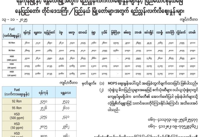 ရန်ကုန်မြို့နှင့် မန္တလေးမြို့အတွက် ရည်ညွှန်းလက်ကားဈေးနှုန်းများနှင့် ပြည်ထောင်စုနယ်မြေ နေပြည်တော်၊ တိုင်းဒေaသကြီး/ပြည်နယ် မြို့တော်များအတွက် ရည်ညွှန်းလက်လီဈေးနှုန်းများ