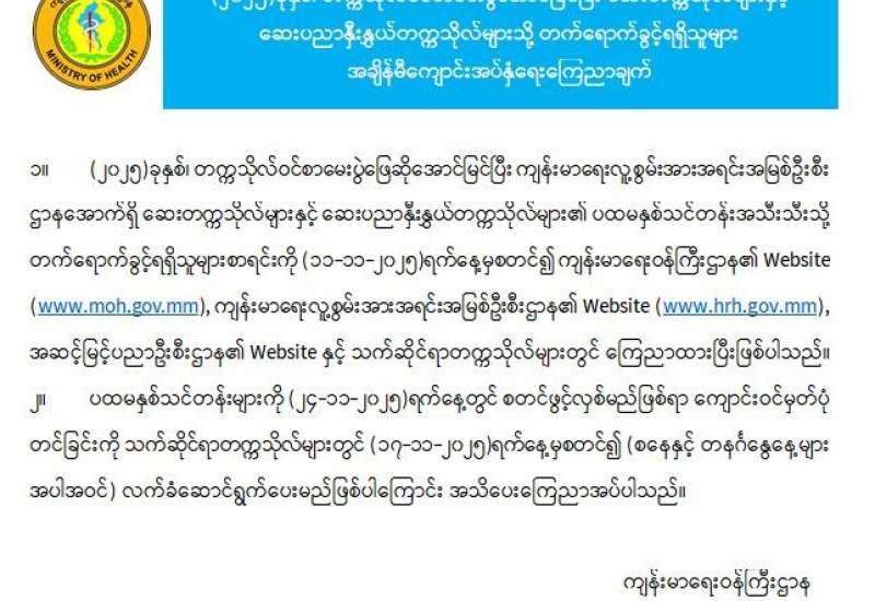 (၂ဝ၂၅) ခုနှစ်၊ တက္ကသိုလ်ဝင်စာမေးပွဲအောင်မြင်ပြီး ဆေးတက္ကသိုလ်များနှင့် ဆေးပညာနှီးနွယ်တက္ကသိုလ်များသို့ တက်ရောက်ခွင့်ရရှိသူများ အချိန်မီကျောင်းအပ်နှံရေး ကြေညာချက်