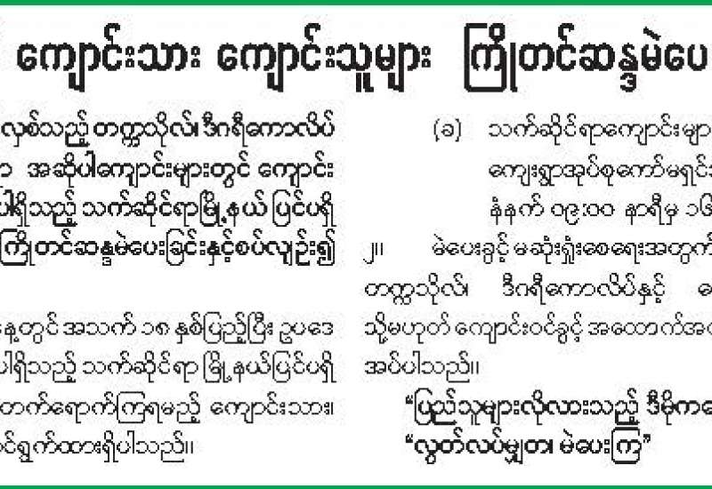 ပါတီစုံဒီမိုကရေစီအထွေထွေရွေးကောက်ပွဲ အပိုင်း (၁) ကျင်းပမည့်ရက်မှာ တစ်ရက်ထက်တစ်ရက် ပိုမိုနီးကပ်လာပြီဖြစ်သည်။ ရွေးကောက်ပွဲ အပိုင်း (၁)၊ အပိုင်း (၂) နှင့် အပိုင်း (၃) တို့ကို ရက်သတ္တပတ် နှစ်ပတ်စီခြား၍ ကျင်းပသွားမည်ဖြစ်ရာ လာမည့်နှစ်ဇန်နဝါရီလမကုန်မီ သုံးပိုင်းလုံးပြီးစီးနေမည်ဖြစ်သည်။ “ဤသည်မှာ ပါတီစုံဒီမိုကရေစီအထွေထွေရွေးကောက်ပွဲ လုပ်ငန်းစဉ်များအောင်မြင်ပြီး ပြည်သူလူထုတစ်ရပ်လုံးလိုလားတောင့်တသည့် ပါတီစုံဒီမိုကရေစီစနစ်ကို အောင်မြင်စွာ လျှောက်လှမ်းနိုင်ရေးပြည်သူလူထု၏ ပူးပေါင်းပါဝင်မှုဖြင့် အကောင်အထည်ဖော်ဆောင်ရွက်ရေး” ဟူသော ဦးတည်ချက်နှင့်အညီ ဆောင်ရွက်နေခြင်းဖြစ်ရာ ပြည်သူလူထုပူးပေါင်းဆောင်ရွက်မှုအားမှာ လွန်စွာအရေးကြီးသည်။