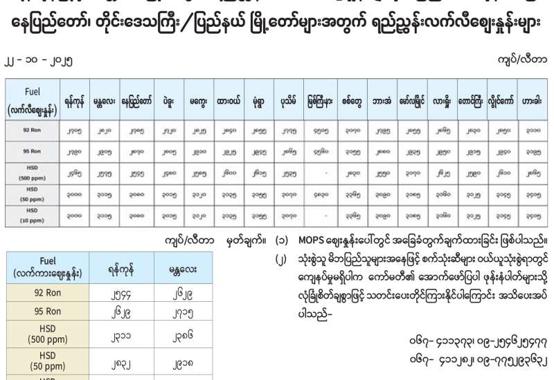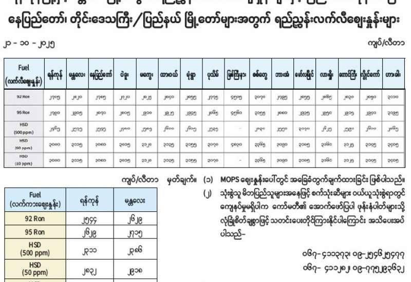ရန်ကုန်မြို့နှင့် မန္တလေးမြို့အတွက် ရည်ညွှန်းလက်ကားဈေးနှုန်းများနှင့် ပြည်ထောင်စုနယ်မြေ နေပြည်တော်၊ တိုင်းဒေသကြီး/ပြည်နယ် မြို့တော်များအတွက် ရည်ညွှန်းလက်လီစျေးနှုန်းများ
