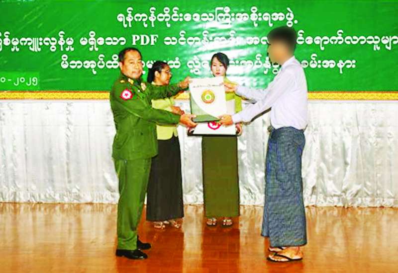 နိုင်ငံတော်အစိုးရသည် PDF အပါအဝင် အဖွဲ့အစည်းအမျိုးမျိုး အမည်ခံ၍ လက်နက်ကိုင်ဆန့်ကျင် လျက်ရှိသည့်် အဖွဲ့အစည်းများ အတွင်း ရောက်ရှိနေသူများအား ဥပဒေဘောင်အတွင်းသို့ ပြန်လည် ဝင်ရောက်ရန် ဖိတ်ခေါ်၍ ဥပဒေဘောင်အတွင်းသို့ ပြန်လည်ဝင်ရောက်လာကြသူများကိုလည်း လိုအပ်သည့်ကူညီပံ့ပိုးမှုများ ဆောင်ရွက်ပေးလျက်ရှိရာ နိုင်ငံတော်နှင့်တပ်မတော်၏ ငြိမ်းချမ်းရေးလုပ်ငန်းစဉ်များကို နားလည် သဘောပေါက်လာသည့် PDF အမည်ခံအဖွဲ့မှ အဖွဲ့ဝင် အမျိုးသား ၁၂ ဦးနှင့် အမျိုးသမီး သုံးဦးတို့သည် ယနေ့တွင် ဥပဒေဘောင်အတွင်းသို့ ထပ်မံဝင်ရောက်လာကြသည်။