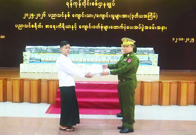 ၂၀၂၅−၂၀၂၆ ပညာသင်နှစ်တွင် တက်ရောက်ပညာသင်ကြားလျက်ရှိသည့် ရန်ကုန်တိုင်း စစ်ဌာနချုပ်နှင့် ကွပ်ကဲမှုအောက် တပ်ရင်း/တပ်ဖွဲ့များမှ တပ်မတော်သားမိသားစုဝင် ကျောင်းသား ကျောင်းသူများအား ဒုတိယအကြိမ် ပညာသင်စရိတ်၊ စာရေးကိရိယာနှင့် ကျောင်းဝတ်စုံများ ပေးအပ်ခြင်းကို ယနေ့နံနက်ပိုင်းတွင် တိုင်းစစ်ဌာနချုပ် အနော်ရထာခန်းမ၌ပြုလုပ်ရာ တိုင်းမှူး ဗိုလ်ချုပ် ပြည့်စုံလင်းနှင့် တာဝန်ရှိသူများ၊ အရာရှိ၊ စစ်သည်၊ မိသားစုများ၊ ကျောင်းသား ကျောင်းသူများ တက်ရောက်ကြသည်။