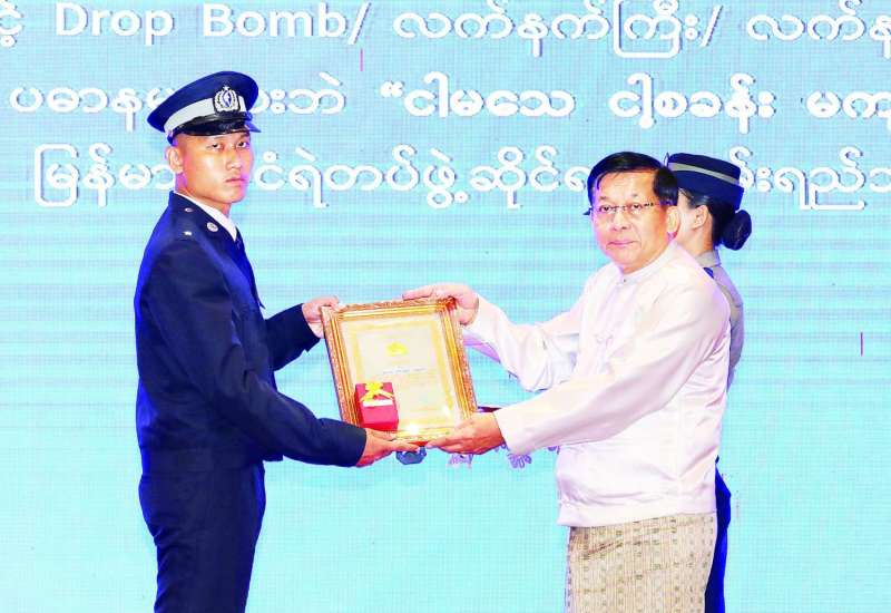 (၆၁)နှစ်မြောက် မြန်မာနိုင်ငံရဲတပ်ဖွဲ့နေ့ အထိမ်းအမှတ်ဂုဏ်ပြုညစာစားပွဲ အခမ်းအနားကို ယနေ့ညပိုင်းတွင် နေပြည်တော်ရှိ မင်္ဂလာသီရိဟိုတယ်၌ကျင်းပရာ ပြည်ထောင်စုသမ္မတ မြန်မာနိုင်ငံတော်ယာယီသမ္မတ နိုင်ငံတော်လုံခြုံရေးနှင့် အေးချမ်းသာယာရေးကော်မရှင် ဥက္ကဋ္ဌ ဗိုလ်ချုပ်မှူးကြီး မင်းအောင်လှိုင် တက်ရောက်ချီးမြှင့်သည်။