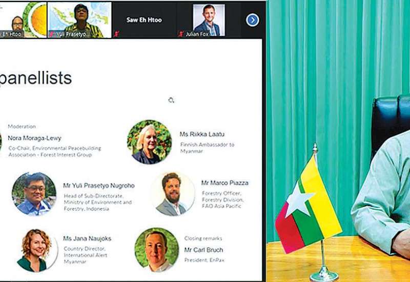 သစ်တောကဏ္ဍ၌ လူ့အခွင့်အရေးနှင့် ပဋိပက္ခဖြစ်စေနိုင်သည့် အခြေအနေများကို အထူး ဂရုပြုသည့် နည်းလမ်းများဖြင့် အကောင်အထည်ဖော် ဆောင်ရွက်ခြင်းဆိုင်ရာ Online ဆွေးနွေးပွဲ Webinar ကို ယမန်နေ့ညနေ ၆ နာရီခွဲက ကျင်းပသည်။