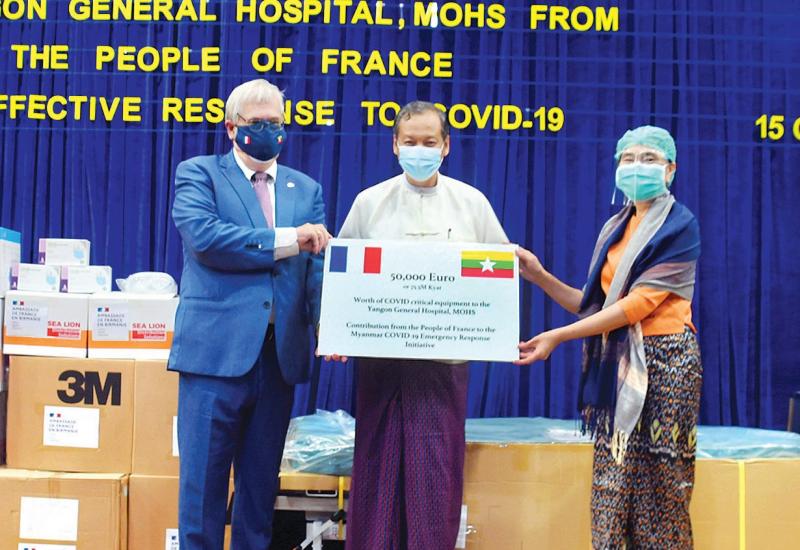 ရန်ကုန်ပြည်သူ့ဆေးရုံကြီးသို့ ပြင်သစ်နိုင်ငံမှ  ကိုဗစ် - ၁၉ ရောဂါ ကုသရေးတွင် အသုံးပြုရန်အတွက် ဆေးပစ္စည်းကိရိယာများ  ပေးအပ်လှူဒါန်းပွဲအခမ်းအနားကို ယနေ့ မွန်းလွဲ ၂ နာရီခွဲက ရန်ကုန်မြို့ ဒဂုံမြို့နယ် ဇီဝကလမ်း  အမှတ် (၅) ရှိ ဆေးသုတေသနဦးစီးဌာန (ရုံးချုပ်) အစည်းအဝေးခန်းမ၌ ပြုလုပ်သည်။