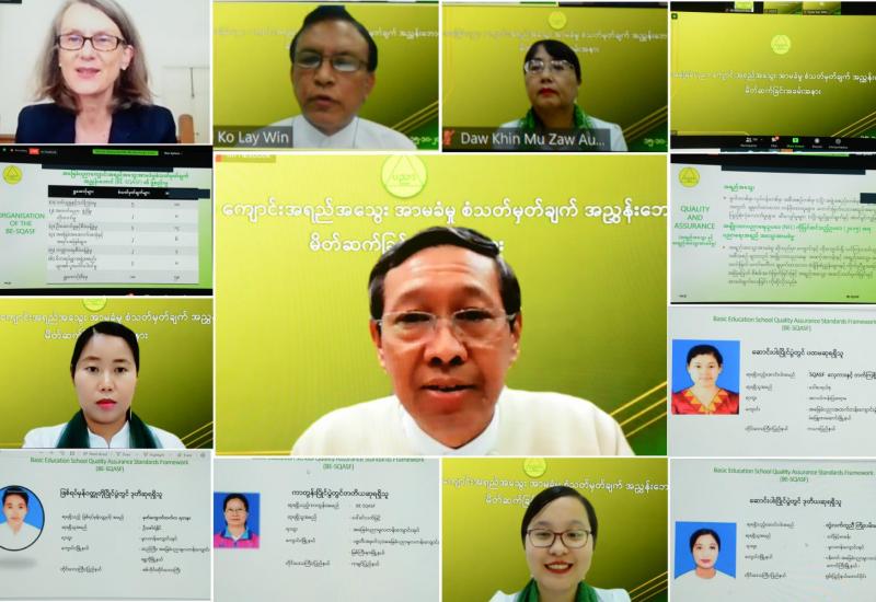 အခြေခံပညာကျောင်းအရည်အသွေးအာမခံမှု စံသတ်မှတ်ချက်အညွှန်းဘောင် မိတ်ဆက်ခြင်းအခမ်းအနားကို ယနေ့မွန်းလွဲ (၂) နာရီတွင် နေပြည်တော်ရှိ ပညာရေး ဝန်ကြီးဌာန အစည်းအဝေးခန်းမ၌ Video Conferencing စနစ်ဖြင့် ကျင်းပသည်။