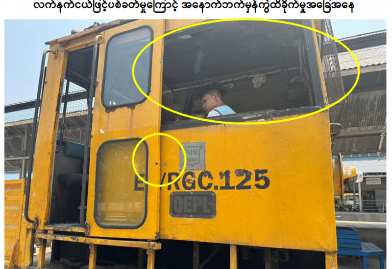 ယနေ့ ဖြူး- တောင်ငူလမ်းပိုင်း လုံခြုံရေးစစ်ဆေးသည့် RGC-125 သည် ညောင်ခြေထောက်ဘူတာမှ နံနက် ၇ နာရီ ၃၆ မိနစ် ထွက်ခွာလာပြီး ညောင်ခြေထောက်နှင့် ကျွဲပွဲဘူတာအကြား မိုင် ၁၄၄/၁၀-၁၁ ခန့်အရောက် နံနက် ၇ နာရီ ၅၀ မိနစ်တွင် သံလမ်းအနောက်ဘက် ရန်ကုန်-မန္တလေးကားလမ်းဘက်မှ လက်နက်ငယ်ဖြင့် ပစ်ခတ်သဖြင့် RGC 125 စက်ခေါင်း၏ အနောက်ဖက်မှန်တစ်ချပ်ကွဲပြီး အနောက်ဖက်သံဘောင်တွင် ကျဉ်ထိမှန်ခဲ့ကြောင်းနှင့် အဆိုပါပစ်ခတ်မှုကြောင့် စက်ခေါင်းမောင်းနှင့် လုံခြုံရေးတပ်ဖွဲ့များ ထိခိုက်မှုမရှိကြောင်း သတင်းရရှိသည်။
