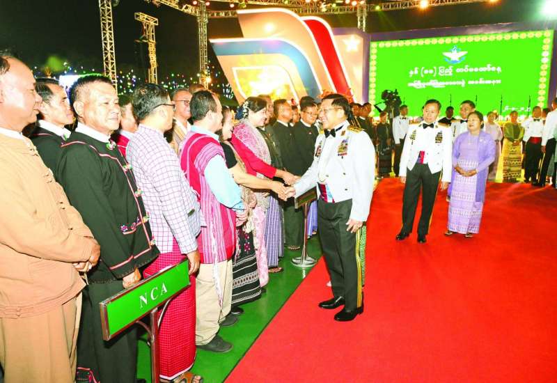 နိုင်ငံတော်စီမံအုပ်ချုပ်ရေးကောင်စီဥက္ကဋ္ဌ တပ်မတော်ကာကွယ်ရေးဦးစီးချုပ် ဗိုလ်ချုပ်မှူးကြီးမင်းအောင်လှိုင်နှင့်ဇနီး ဒေါ်ကြူကြူလှတို့က တည်ခင်းဧည့်ခံသည့် ၂၀၂၅ ခုနှစ် နှစ် (၈၀) ပြည့် တပ်မတော်နေ့အထိမ်းအမှတ် အကြိုဂုဏ်ပြုညစာစားပွဲ အခမ်းအနားကို ယနေ့ညပိုင်းတွင် နေပြည်တော်ရှိ ဇေယျာသီရိဗိမာန် ဥပစာရင်ပြင်၌ ကျင်းပပြုလုပ်သည်။