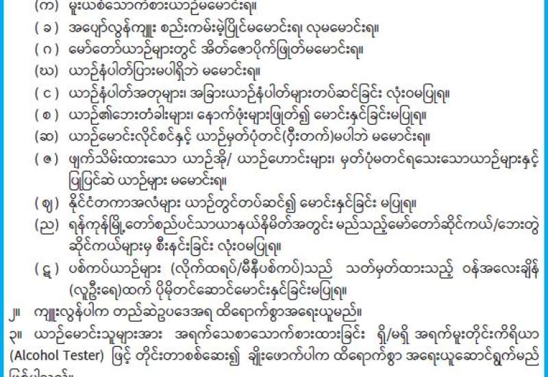 မြန်မာသက္ကရာဇ် ၁၃၈၇ ခုနှစ် တန်ခူးလဆုတ် (၁၂) ရက်နေ့မှ ကဆုန်လဆန်း (၁) ရက်နေ့အထိ (၂၀၂၆ ခုနှစ် ဧပြီလ ၁၃ ရက်နေ့မှ ၁၆ ရက်နေ့အထိ) မြန်မာ့ရိုးရာမဟာသင်္ကြန်ပွဲတော်တွင် ယာဉ်မောင်းသူများမှ သတိပြုရန်အချက်များ