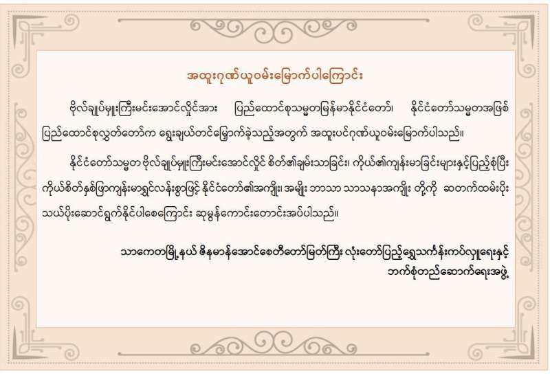 ပြည်ထောင်စုသမ္မတမြန်မာနိုင်ငံတော် ရွေးကောက်တင်မြှောက်ခြင်းခံရသော သမ္မတ နိုင်ငံတော်လုံခြုံရေးနှင့်အေးချမ်းသာယာရေးကော်မရှင်ဥက္ကဋ္ဌ ဗိုလ်ချုပ်မှူးကြီး မင်းအောင်လှိုင် ထံသို့ မြန်မာနိုင်ငံဆိုင်ရာ အိုက်စလန်နိုင်ငံဂုဏ်ထူးဆောင်ကောင်စစ်ဝန် ဦးကိုကိုလတ်ထံမှ ဝမ်းမြောက်ကြောင်းသဝဏ်လွှာ ပေးပို့သည်။