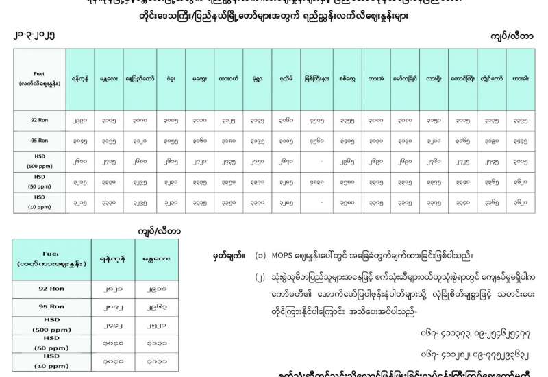ရန်ကုန်မြို့နှင့် မန္တလေးမြို့အတွက် ရည်ညွှန်းလက်ကားဈေးနှုန်းများနှင့် ပြည်ထောင်စုနယ်မြေ နေပြည်တော်၊ တိုင်းဒေသကြီး/ပြည်နယ် မြို့တော်များအတွက် ရည်ညွှန်းလက်လီဈေးနှုန်းများ