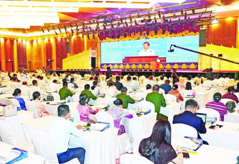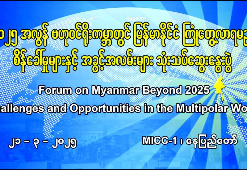 “၂၀၂၅ အလွန် ဗဟုဝင်ရိုးကမ္ဘာတွင် မြန်မာနိုင်ငံကြုံတွေ့လာရမည့် စိန်ခေါ်မှုများနှင့် အခွင့်အလမ်းများ” သုံးသပ်ဆွေးနွေးပွဲ (Forum on Myanmar Beyond 2025: Challenges and Oppor-tunities in the Multipolar World) ကို ယနေ့တွင် နေပြည်တော်ရှိ မြန်မာအပြည်ပြည်ဆိုင်ရာကွန်ဗင်းရှင်းဗဟိုဌာန-၁ (MICC-I) ၌ ကျင်းပသည်။