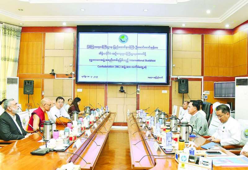 ပြန်ကြားရေးဝန်ကြီးဌာန ပြည်ထောင်စုဝန်ကြီး ဦးမောင်မောင်အုန်းအား အိန္ဒိယနိုင်ငံ ယဉ်ကျေးမှုဝန်ကြီးဌာနအောက်ရှိ ဗုဒ္ဓဘာသာအဖွဲ့အစည်းတစ်ခုဖြစ်သည့် International Buddhist Confederation (IBC) အထွေထွေအတွင်းရေးမှူး Ven.Shartse Khensur Rinpoche Jangchup Choeden နှင့်အဖွဲ့သည် ယနေ့နံနက် ၁၀ နာရီတွင် နေပြည်တော်ရှိ ပြန်ကြားရေးဝန်ကြီးဌာန အစည်းအဝေးခန်းမ၌ လာရောက်တွေ့ဆုံသည်။