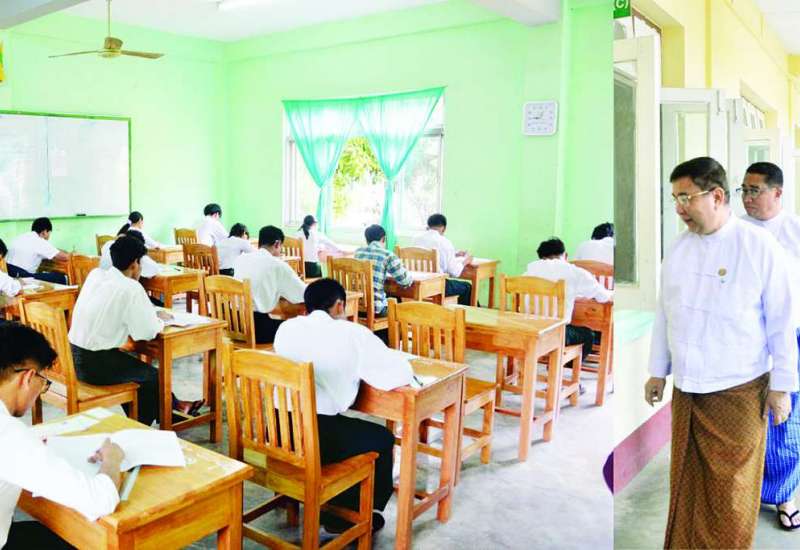 ပညာရေးဝန်ကြီးဌာန ပြည်ထောင်စုဝန်ကြီး ဒေါက်တာညွန့်ဖေ၊ ဒုတိယဝန်ကြီး ဦးနေမျိုးလှိုင်နှင့် တာဝန်ရှိသူများသည် ယနေ့နံနက်ပိုင်းတွင် နေပြည်တော် ဇမ္ဗူသီရိမြို့နယ် အမှတ်(၆)အခြေခံပညာအထက်တန်းကျောင်းနှင့် အမှတ်(၇) အခြေခံပညာအထက်တန်းကျောင်းများရှိ စာစစ်ဌာနသို့ သွားရောက်၍ ၂၀၂၄-၂၀၂၅ ပညာသင်နှစ် တက္ကသိုလ်ဝင်စာမေးပွဲ ဒုတိယနေ့ အင်္ဂလိပ်စာဘာသာရပ်ကို ကျောင်းသား ကျောင်းသူများ အေးချမ်းစွာဖြေဆိုနေမှုကို ကြည့်ရှုအားပေးသည်။