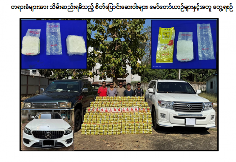 မူးယစ်ဆေးဝါးတားဆီးနှိမ်နင်းရေးရဲတပ်ဖွဲ့မှ တပ်ဖွဲ့ဝင်များပါဝင်သော ပူးပေါင်းအဖွဲ့သည် မတ်လ ၆ ရက်နေ့ ည ၇ နာရီခွဲအချိန် ရန်ကုန်တိုင်းဒေသကြီး၊ ဒဂုံမြို့သစ်(တောင်ပိုင်း)မြို့နယ်၊ (၁၄၄)ရပ်ကွက်၊ ဆင်ဖြူရှင်လမ်း၊ အမှတ်(၅၄၆/၅၄၇)ရှိ ဂိုဒေါင်အား သတင်းအရဝင်ရောက်ရှာဖွေရာ သန်းလွင်၊ ဝေယျာအောင် (ခ)သားကြီး၊ သန့်ကောင်းဆက်(ခ)ပေါင်ချိန်၊ ရဲရင့်နိုင်၊ လှသန်းဦး(ခ)ရာကွတ်တို့ ၅ ဦးအား အိုက်စ်(မက်သ်အဖက်တမင်း) ၁ ဒသမ ၂ တန်၊ TOYOTA HILUX ယာဉ်(၁)စီး၊ TOYOTA LAND CRUISER ယာဉ်(၁)စီးနှင့် MERCEDES BENZ ယာဉ်(၁)စီးတို့နှင့်အတူ ဖမ်းဆီးရမိခဲ့ကြောင်း စစ်ဆေးဖော်ထုတ်ချက်အရ သိမ်းဆည်းရမိ အိုက်စ်(မက်သ်အဖက်တမင်း)များအား "ဝ" ကိုယ်ပိုင်အုပ်ချုပ်ခွင့်ရဒေသ၊ ပန်ဆန်းမြို့တွင်နေထိုင်သူ တင်မောင်ဝင်း၏ အစီအမံဖြင့် သန်းလွင်မှ တာဝန်ခံ သယ်ဆောင်ရောင်းဝယ်ခြင်းဖြစ်ပြီး သန်းလွင်ထံမှ အိုက်စ်(မက်သ်အဖက်တမင်း)များအား ရန်ကုန်မြို့တွင် တစ်ဆင့်ပြန်လည်ရောင်းချသူ ဟိန်းစည်သူ(ခ)ဇော်ဇော်အောင်(ခ)အောင်ကိုကို(ခ) ထင်လင်းပြည့်အား သာကေတမြို့နယ်၊ ရှုခင်းသာလမ်းတွင်လည်းကောင်း၊ စိတ်ပြောင်းဆေးဝါးများအား တစ်ဆင့်ပြန်လည်ရောင်းချရန် ချိတ်ဆက်ပေးသူ တင်လှ(ခ)စသစ်အား ဒဂုံမြို့သစ်(တောင်ပိုင်း)မြို့နယ်၊ (၁၀၄)ရပ်ကွက်တွင်လည်းကောင်း ဖမ်းဆီးရမိခဲ့ကြောင်း သိရှိရပါသည်။