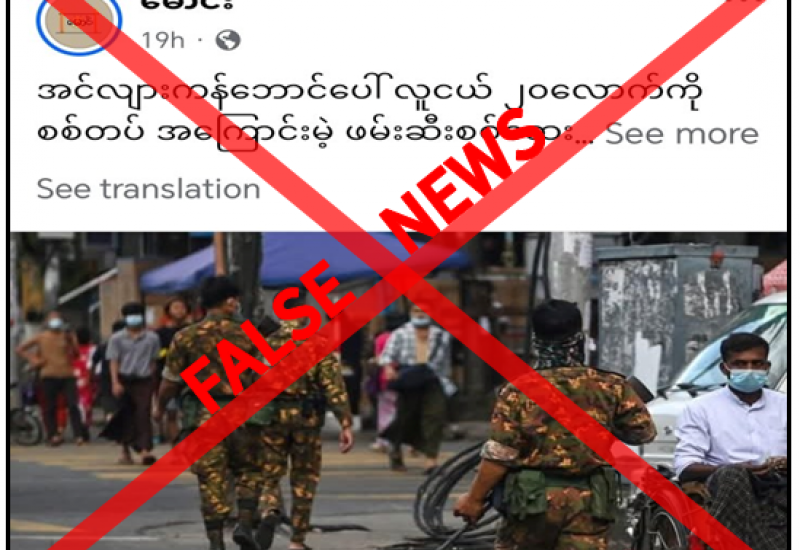 ရန်ကုန်တိုင်းဒေသကြီး၊ ကမ္ဘာအေးဘုရားလမ်းမပေါ်ရှိ အင်လျားကန်ဘောင်တွင် လုံခြုံရေးတပ်ဖွဲ့ဝင်များမှ လူငယ် ၂၀ ဦးခန့်ကို အကြောင်းမဲ့ဖမ်းဆီးစစ်ဆေးခဲ့ပြီး ၆ ဦးခန့်ကို ဖမ်းဆီးခေါ်ဆောင်သွားကြောင်း တရားမဝင်ပြည်ဖျက်မီဒီယာများက သတင်းတု၊ သတင်းအမှားများ မဟုတ်မမှန် လုပ်ကြံရေးသား ဝါဒဖြန့်ဝေလျက်ရှိပါသည်။