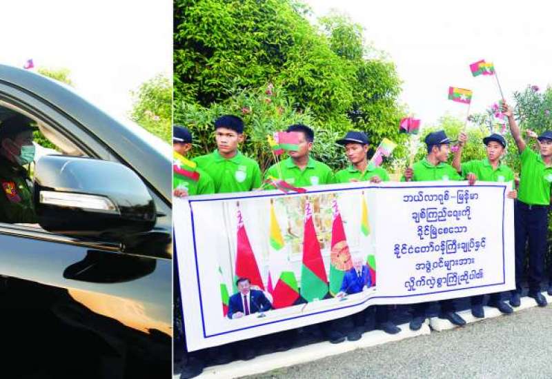 ရုရှားဖက်ဒရေးရှင်းနိုင်ငံနှင့် ဘယ်လာရုစ်နိုင်ငံတို့သို့ သွားရောက်ခဲ့သည့် တရားဝင်ချစ်ကြည်ရေးခရီးစဉ်မှ ပြန်လည်ရောက်ရှိလာသည့် နိုင်ငံတော်စီမံအုပ်ချုပ်ရေးကောင်စီဥက္ကဋ္ဌ နိုင်ငံတော်ဝန်ကြီးချုပ် ဗိုလ်ချုပ်မှူးကြီးမင်းအောင်လှိုင် ဦးဆောင်သည့် မြန်မာအဆင့်မြင့်ကိုယ်စားလှယ်အဖွဲ့အား ပြည်သူများက လှိုက်လှိုက်လှဲလှဲ၊ သောင်းသောင်းဖြဖြ ကြိုဆိုဂုဏ်ပြုနှုတ်ဆက်ကြသည်။