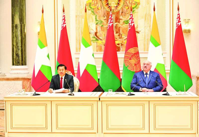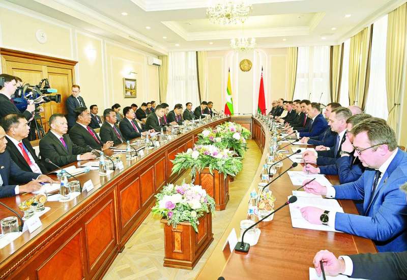 ဘယ်လာရုစ်သမ္မတနိုင်ငံ မင့်စ်မြို့၌ နိုင်ငံတော်အဆင့် ချစ်ကြည်ရေးခရီးရောက်ရှိနေသည့် နိုင်ငံတော်စီမံအုပ်ချုပ်ရေးကောင်စီဥက္ကဋ္ဌ နိုင်ငံတော်ဝန်ကြီးချုပ် ဗိုလ်ချုပ်မှူးကြီး မင်းအောင်လှိုင်သည် ဘယ်လာရုစ်သမ္မတနိုင်ငံဝန်ကြီးချုပ် H.E. Mr. Roman Alexand-rovich Golovchenko နှင့် ယနေ့ဒေသစံတော်ချိန် ညနေပိုင်းတွင် ဝန်ကြီးချုပ်ရုံးအစည်းအဝေးခန်းမ၌ တွေ့ဆုံဆွေးနွေးသည်။