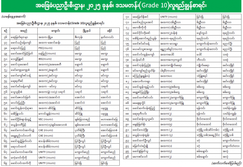 အခြေခံပညာဦးစီးဌာန၊ ၂၀၂၅ ခုနှစ်၊ ဒသမတန်း(Grade 10)လူရည်ချွန်စာရင်း