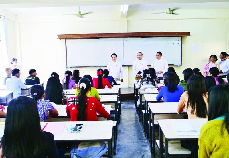 ပညာရေးဝန်ကြီးဌာန ဒုတိယဝန်ကြီး ဒေါက်တာဇော်မြင့်သည် ယမန်နေ့နံနက်ပိုင်းက ရန်ကင်း ပညာရေးဒီဂရီကောလိပ်သို့ ရောက်ရှိပြီး ကျောင်းအုပ်ကြီး၊ ဆရာ ဆရာမများ၊ ကျောင်းသား ကျောင်းသူများနှင့် တွေ့ဆုံသည်။
