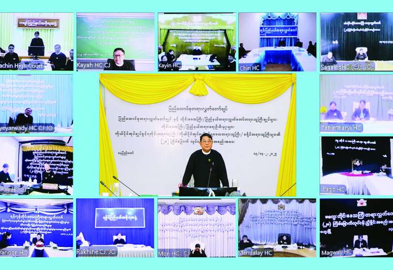 ပြည်ထောင်စုတရားသူကြီးချုပ်သည် တိုင်းဒေသကြီး/ ပြည်နယ်တရားလွှတ်တော်များ၊ ကိုယ်ပိုင်အုပ်ချုပ်ခွင့်ရတိုင်း၊ ကိုယ်ပိုင်အုပ်ချုပ်ခွင့်ရဒေသ၊ ခရိုင်တရားရုံးများမှ တရားသူကြီးချုပ်များ၊ တရားသူကြီးများကို နေပြည်တော်ရှိ ပြည်ထောင်စုတရားလွှတ်တော်ချုပ်မှ ယနေ့နံနက်ပိုင်းတွင် ဗီဒီယိုကွန်ဖရင့်စနစ်ဖြင့် တွေ့ဆုံ၍ မှာကြားသည်။