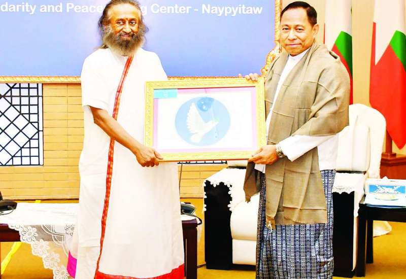 နိုင်ငံတော်စီမံအုပ်ချုပ်ရေးကောင်စီအဖွဲ့ဝင်၊ အမျိုးသားစည်းလုံးညီညွတ်ရေးနှင့် ငြိမ်းချမ်းရေးဖော်ဆောင်မှု ညှိနှိုင်းရေးကော်မတီဥက္ကဋ္ဌ ပြည်ထောင်စုဝန်ကြီး ဒုတိယဗိုလ်ချုပ်ကြီး ရာပြည့်သည် အိန္ဒိယနိုင်ငံမှ လူသားချင်းစာနာထောက်ထားမှုခေါင်းဆောင်နှင့် ငြိမ်းချမ်းရေးသံတမန်ကြီး Gurudev Sri Sri Ravi Shankar ဦးဆောင်သည့် ကိုယ်စားလှယ်အဖွဲ့အား ယနေ့မွန်းလွဲပိုင်းတွင် နေပြည်တော်ရှိ အမျိုးသားစည်းလုံးညီညွတ်ရေးနှင့် ငြိမ်းချမ်းရေးဖော်ဆောင်မှုဗဟိုဌာန၌ လက်ခံတွေ့ဆုံသည်။